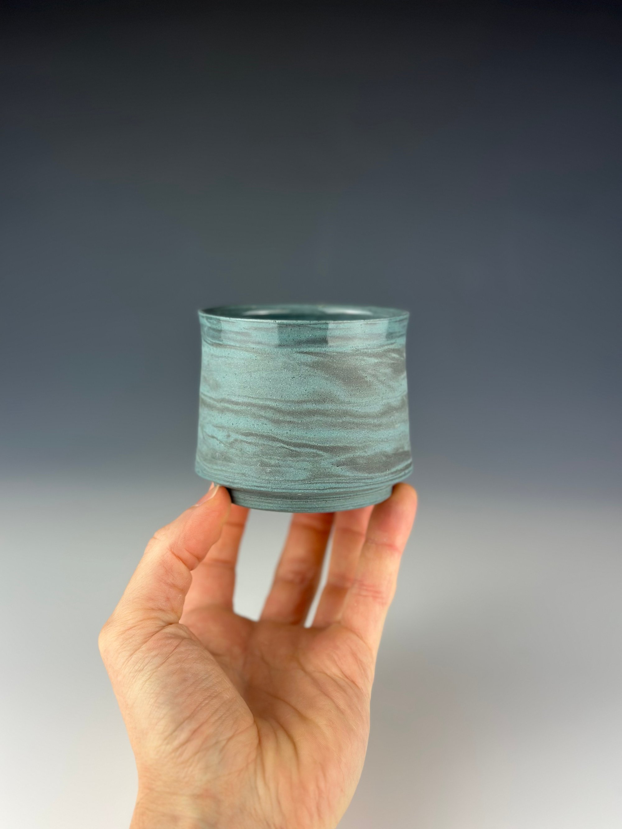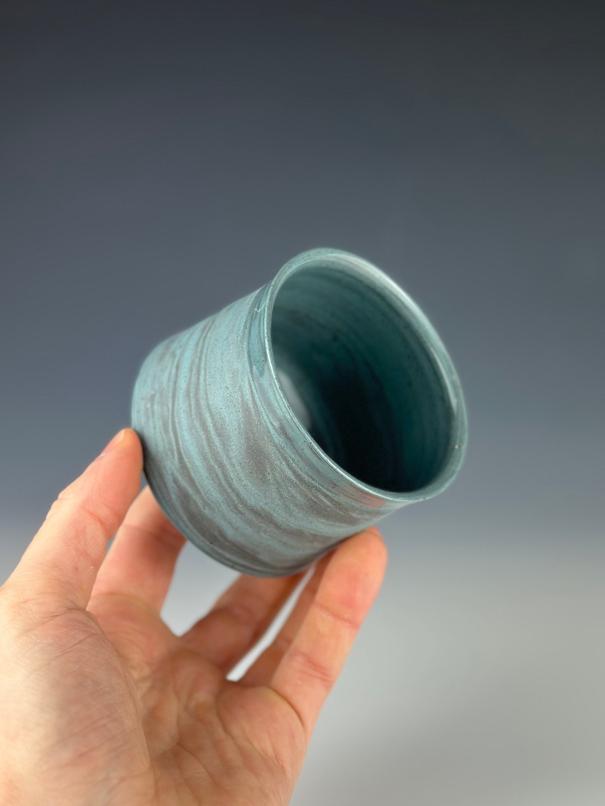 A teal and black marbled porcelain tumbler, which has been clear glazed on the interior and exterior lip, and wet sanded on the exterior unglazed surface.