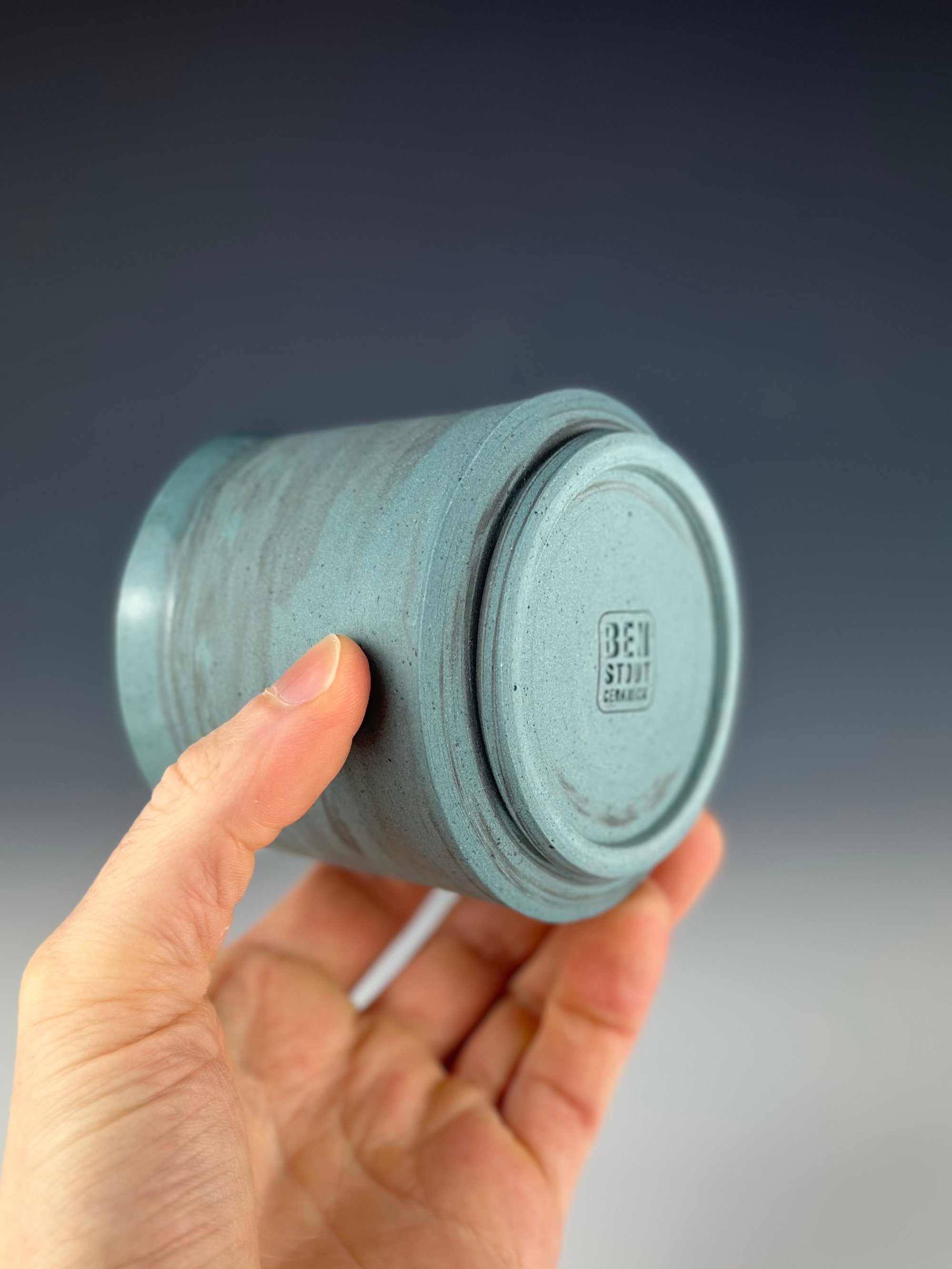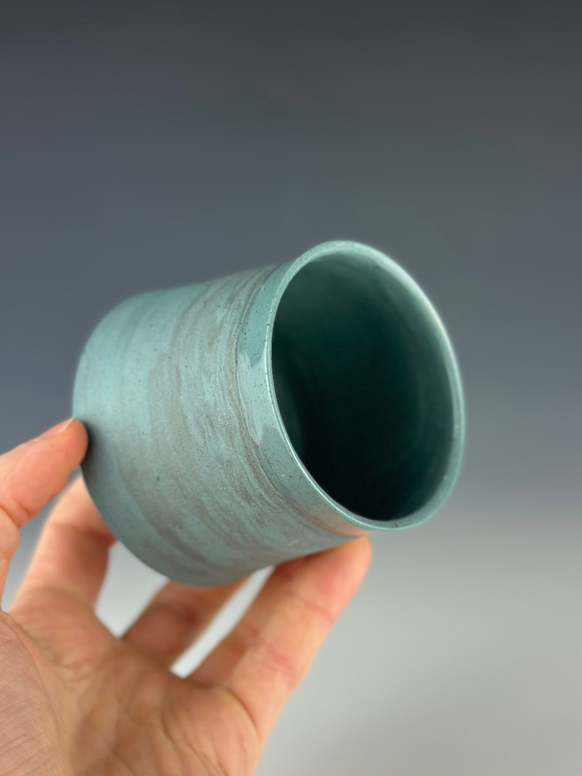 A teal and black marbled porcelain tumbler, which has been clear glazed on the interior and exterior lip, and wet sanded on the exterior unglazed surface.