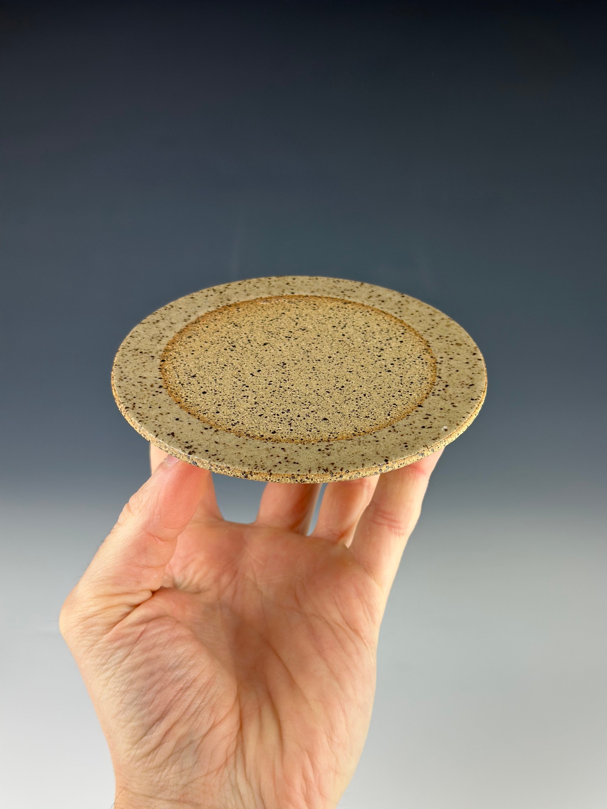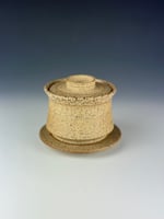 Speckled Stoneware Gaiwan which has been clear glazed on the interior and exterior lip and wet sanded on the exterior unglazed surface. This piece has a carved lid, which has been clear glazed, as well as a base.