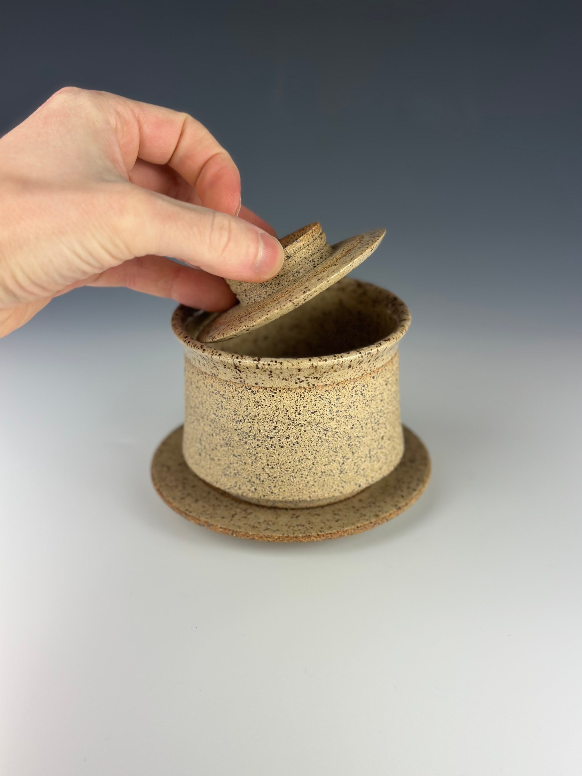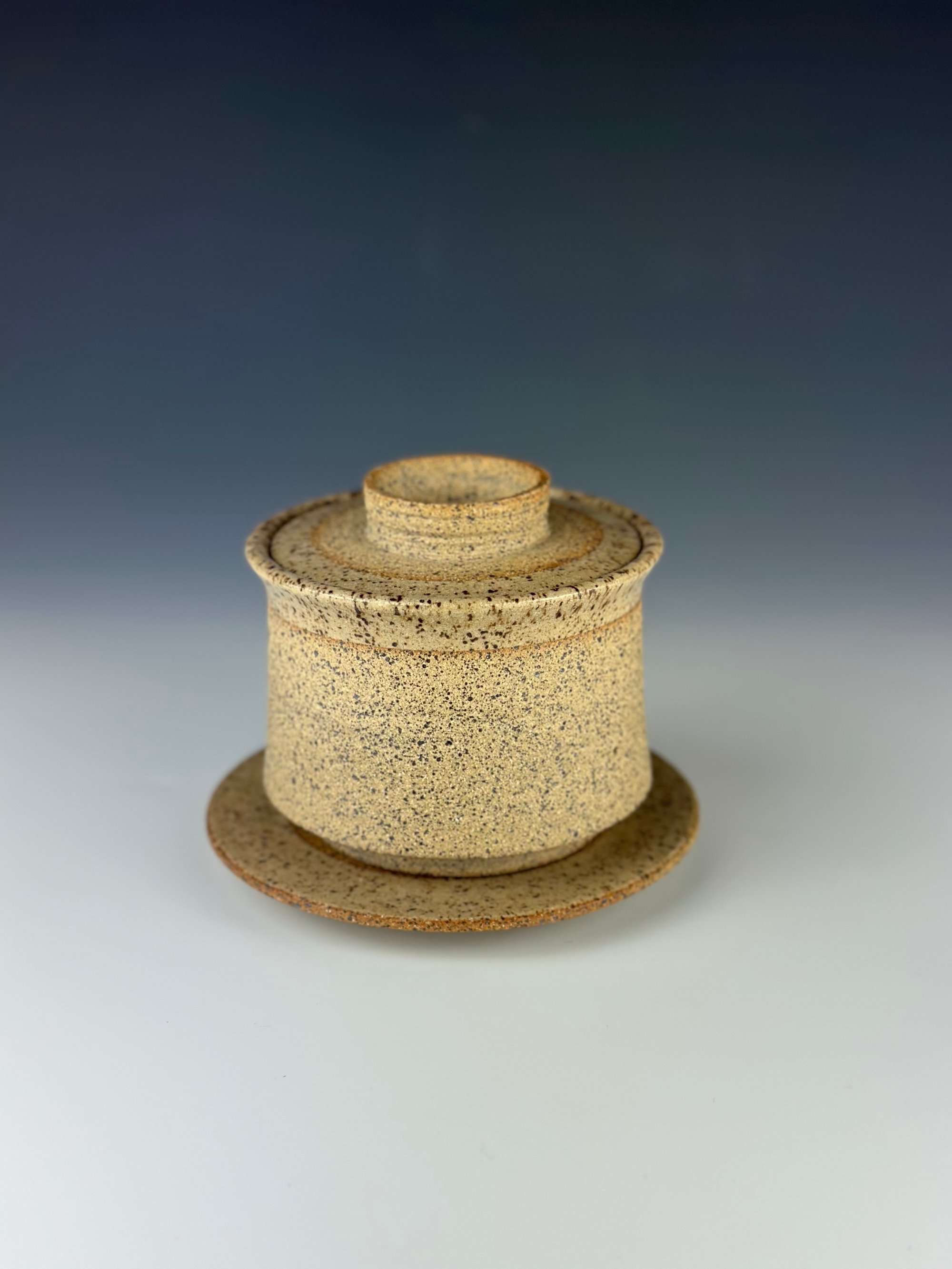 Speckled Stoneware Gaiwan which has been clear glazed on the interior and exterior lip and wet sanded on the exterior unglazed surface. This piece has a carved lid, which has been clear glazed, as well as a base.