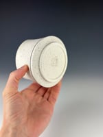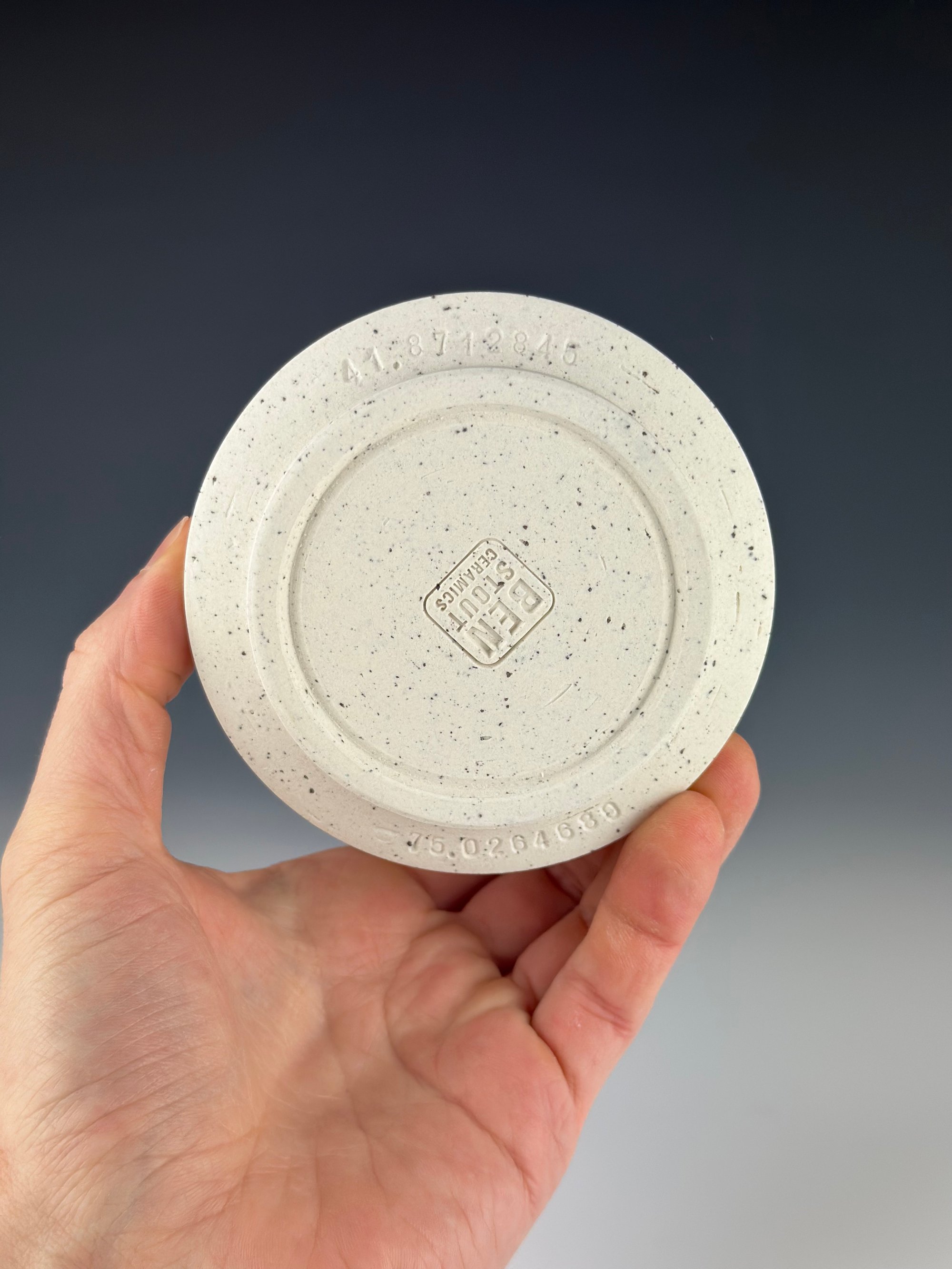 A white porcelain tumbler that has wild slate from the Catskill Mountains of New York. After processing the slate by breaking it down into small pieces, I wedged the sieved granules into porcelain, and threw and trimmed normally. During the trimming stage, I added a black slip line.
