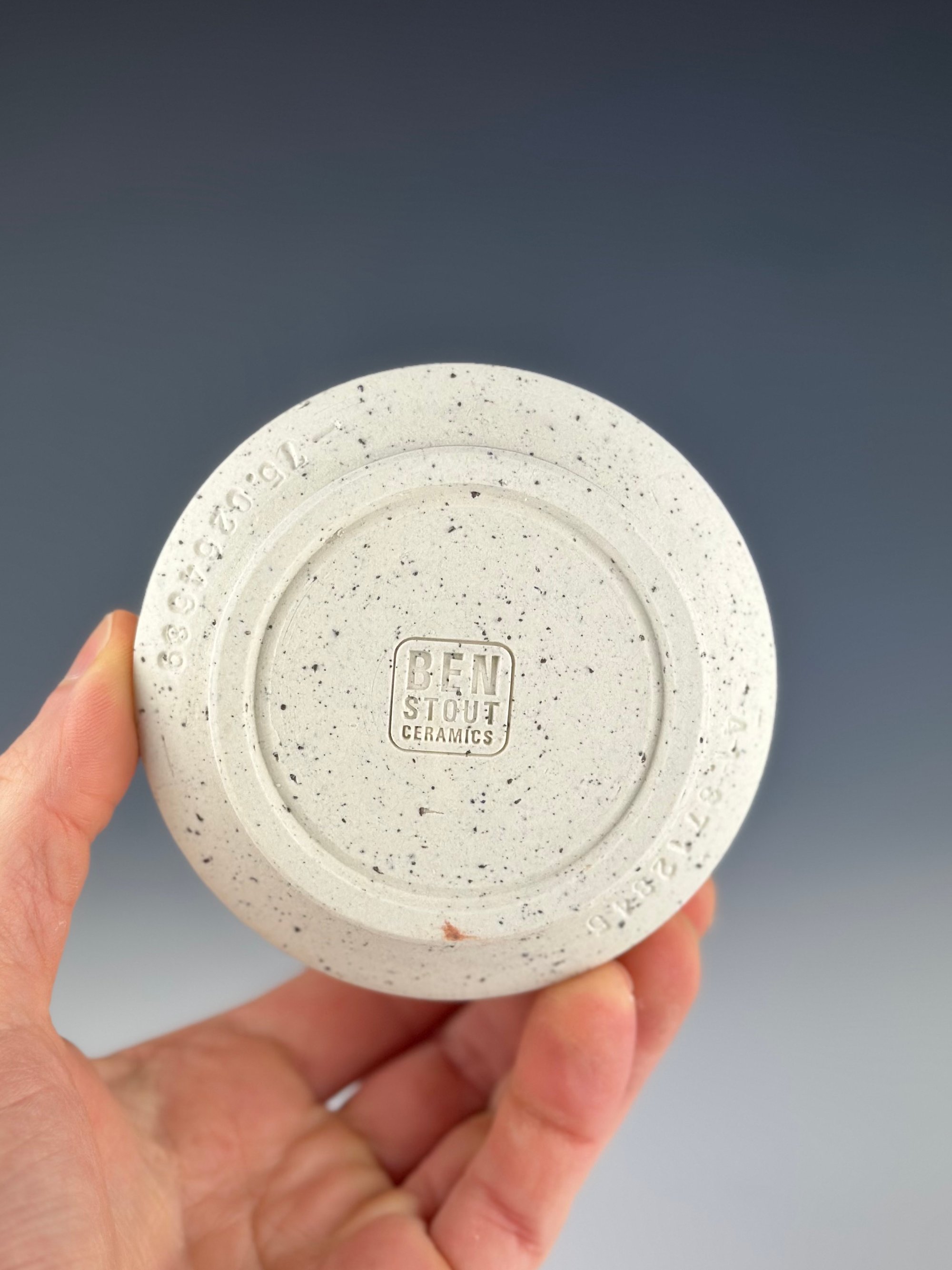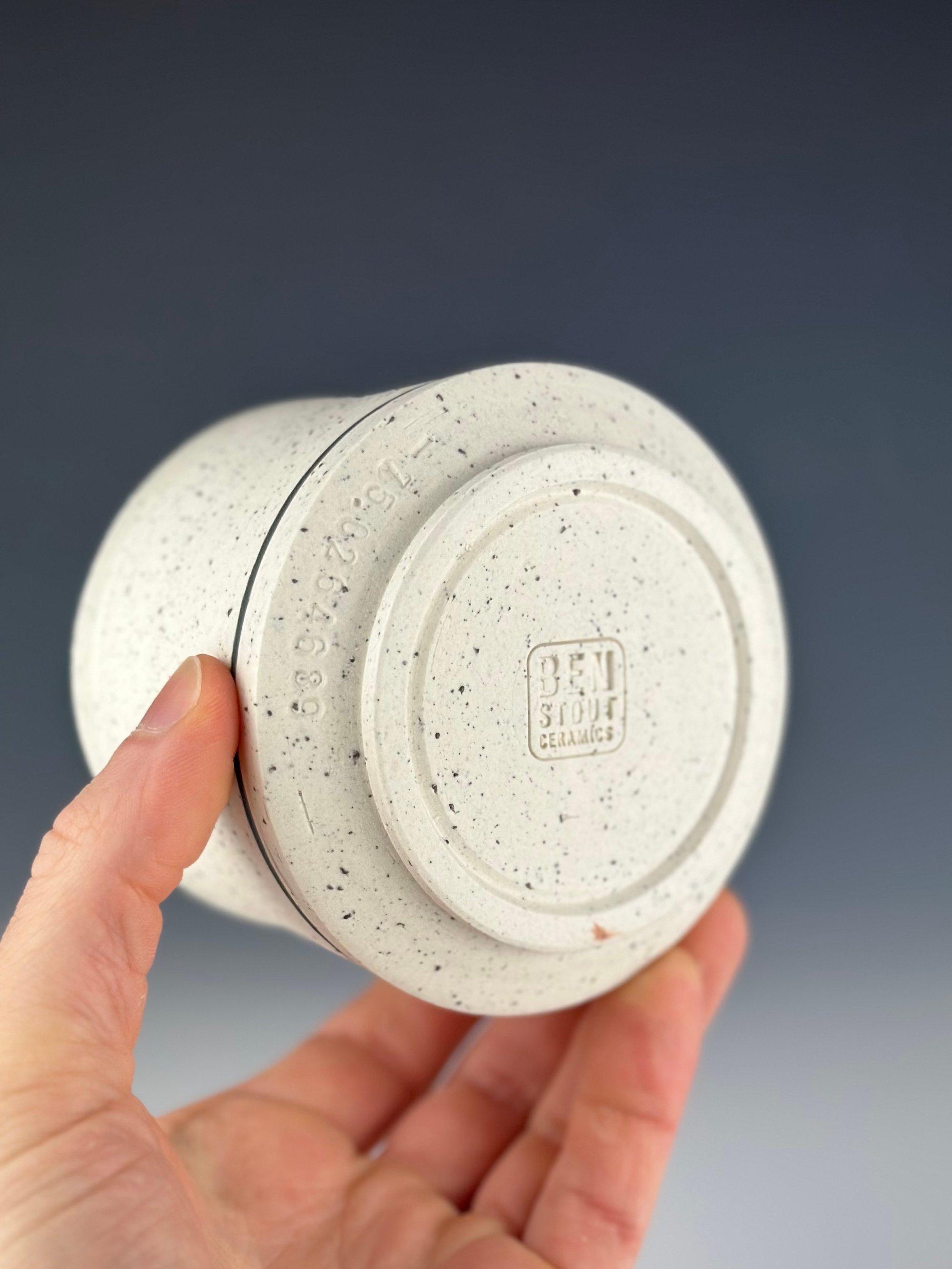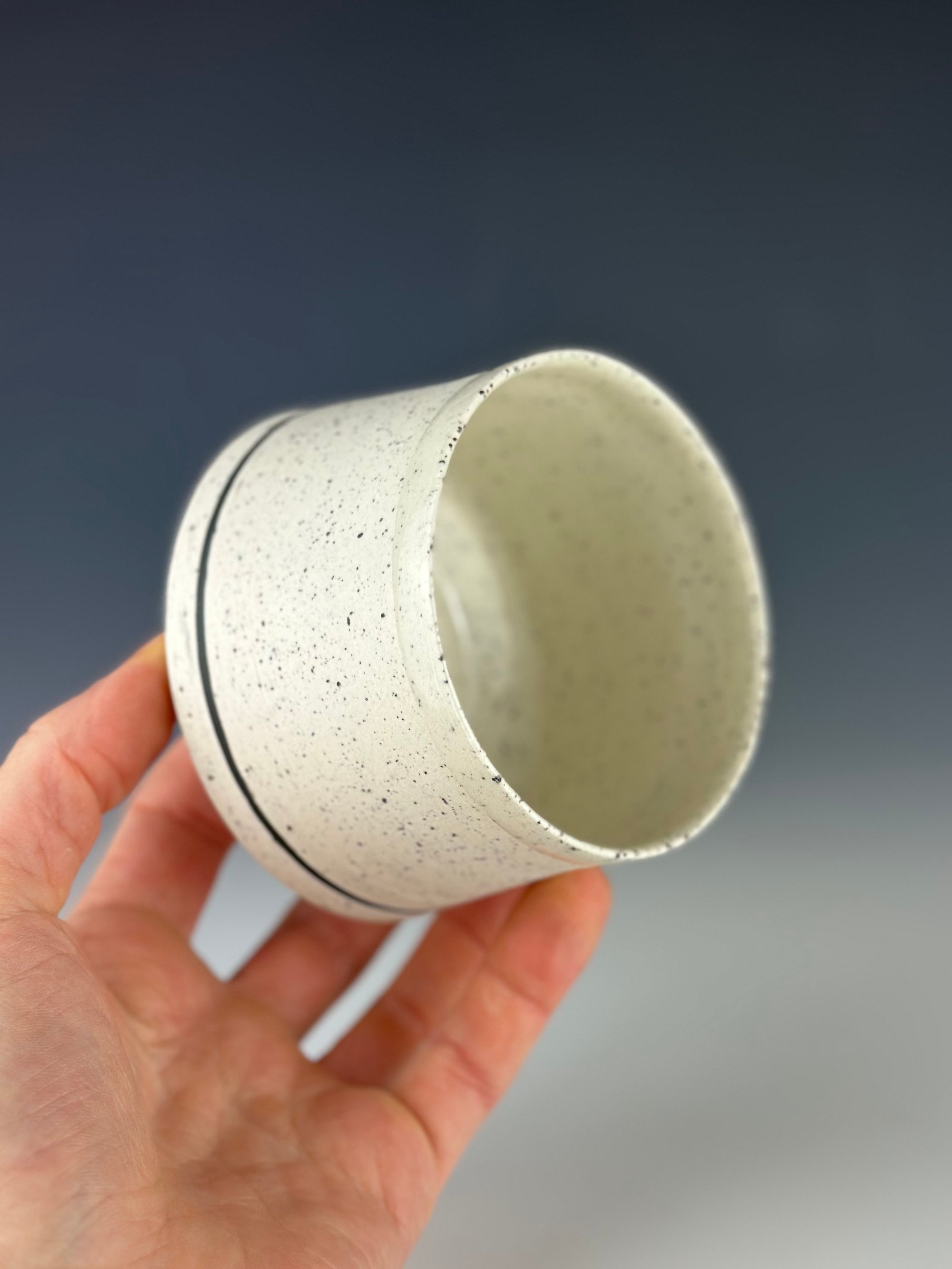 A white porcelain tumbler that has wild slate from the Catskill Mountains of New York. After processing the slate by breaking it down into small pieces, I wedged the sieved granules into porcelain, and threw and trimmed normally. During the trimming stage, I added a black slip line.