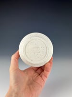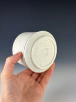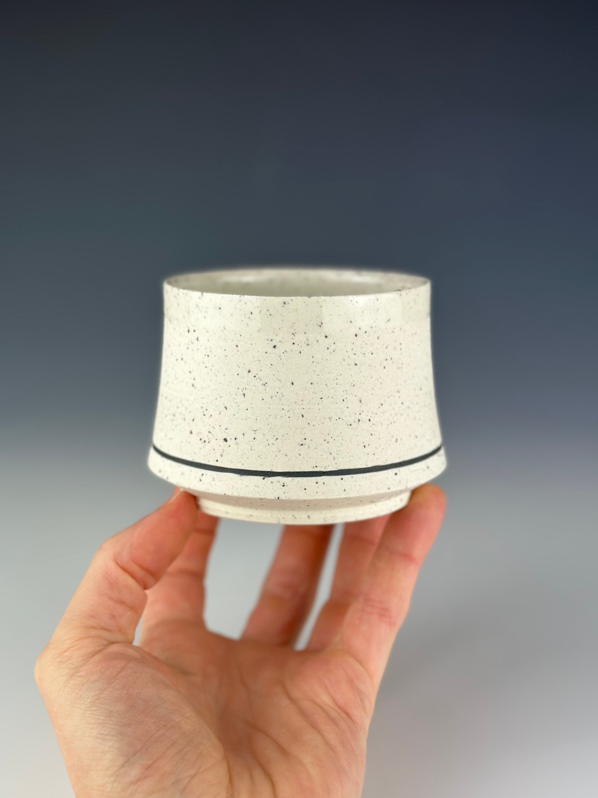 A white porcelain tumbler that has wild slate from the Catskill Mountains of New York. After processing the slate by breaking it down into small pieces, I wedged the sieved granules into porcelain, and threw and trimmed normally. During the trimming stage, I added a black slip line.
