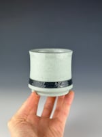 A teal porcelain tumbler which has been clear glazed on the interior and exterior lip, and wet sanded on the exterior unglazed surface. This piece has a raised black slip band towards the base which is lightly textured and then clear glazed.
