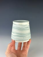A white and teal marbled porcelain tumbler, which has been clear glazed on the interior and exterior lip, and wet sanded on the exterior unglazed surface. This is a slightly taller version vs. the more standard size I make.