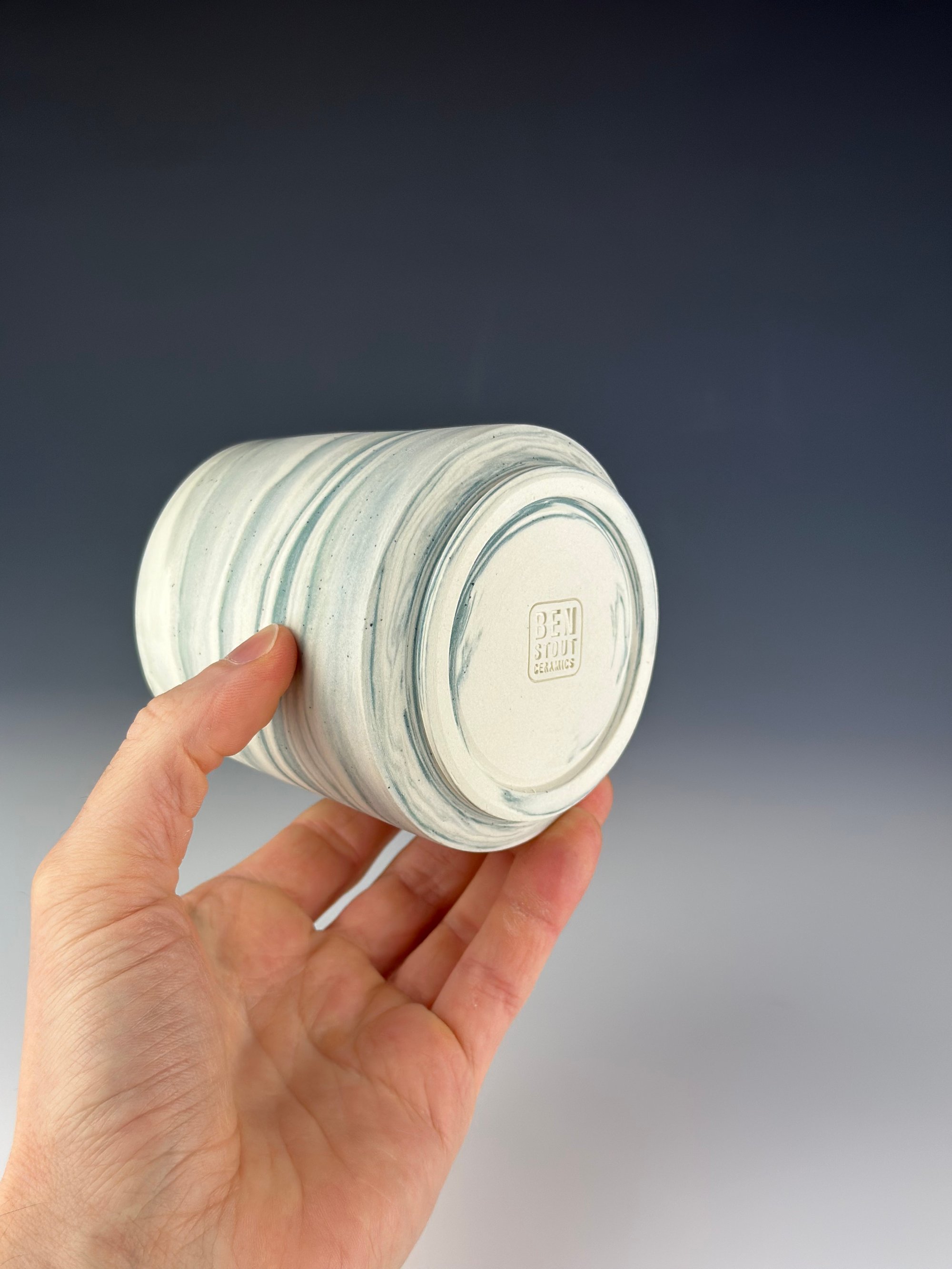 A white and teal marbled porcelain tumbler, which has been clear glazed on the interior and exterior lip, and wet sanded on the exterior unglazed surface. This is a slightly taller version vs. the more standard size I make.