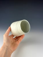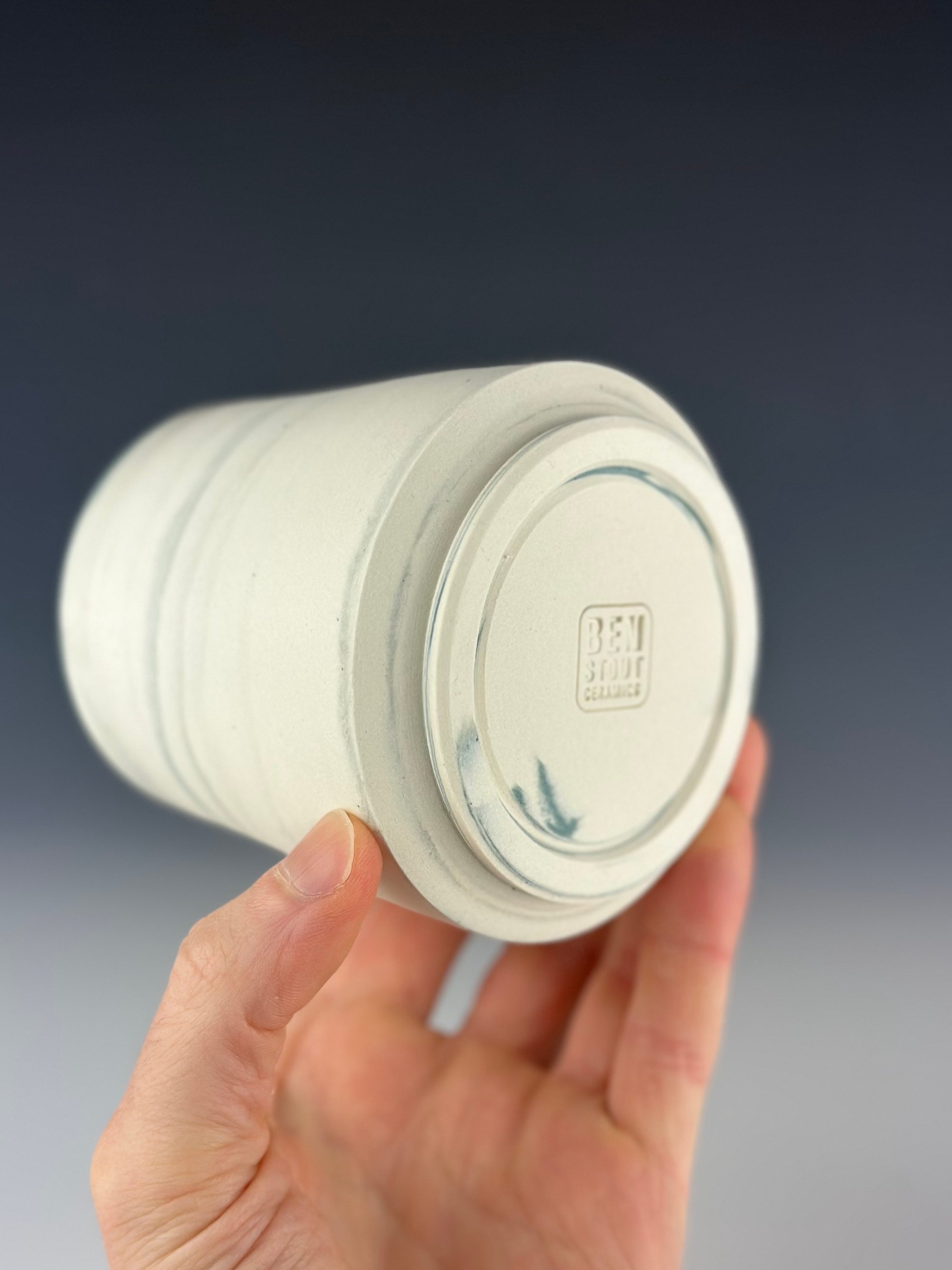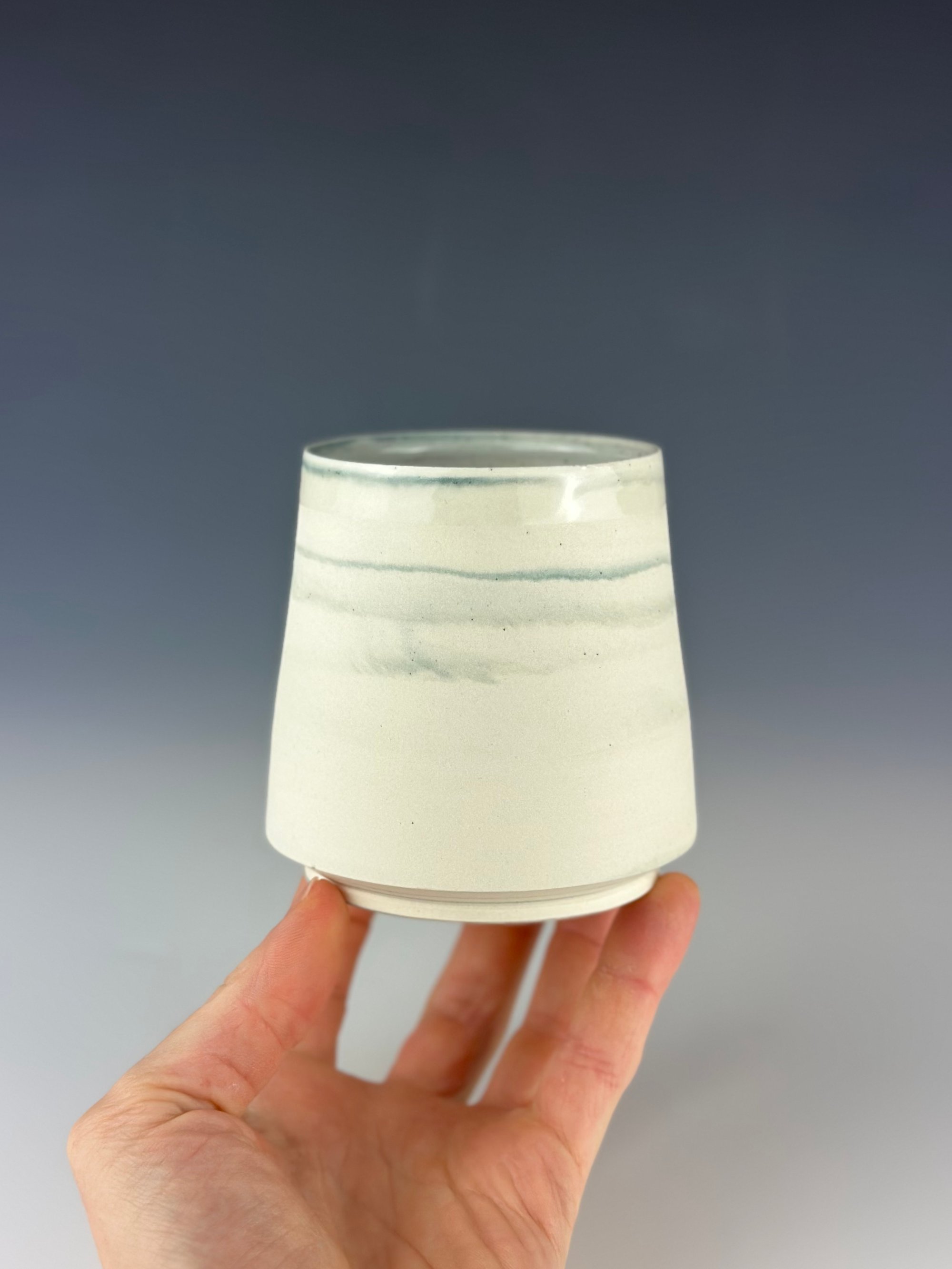 A white and teal marbled porcelain tumbler, which has been clear glazed on the interior and exterior lip, and wet sanded on the exterior unglazed surface. This is a slightly taller version vs. the more standard size I make.