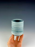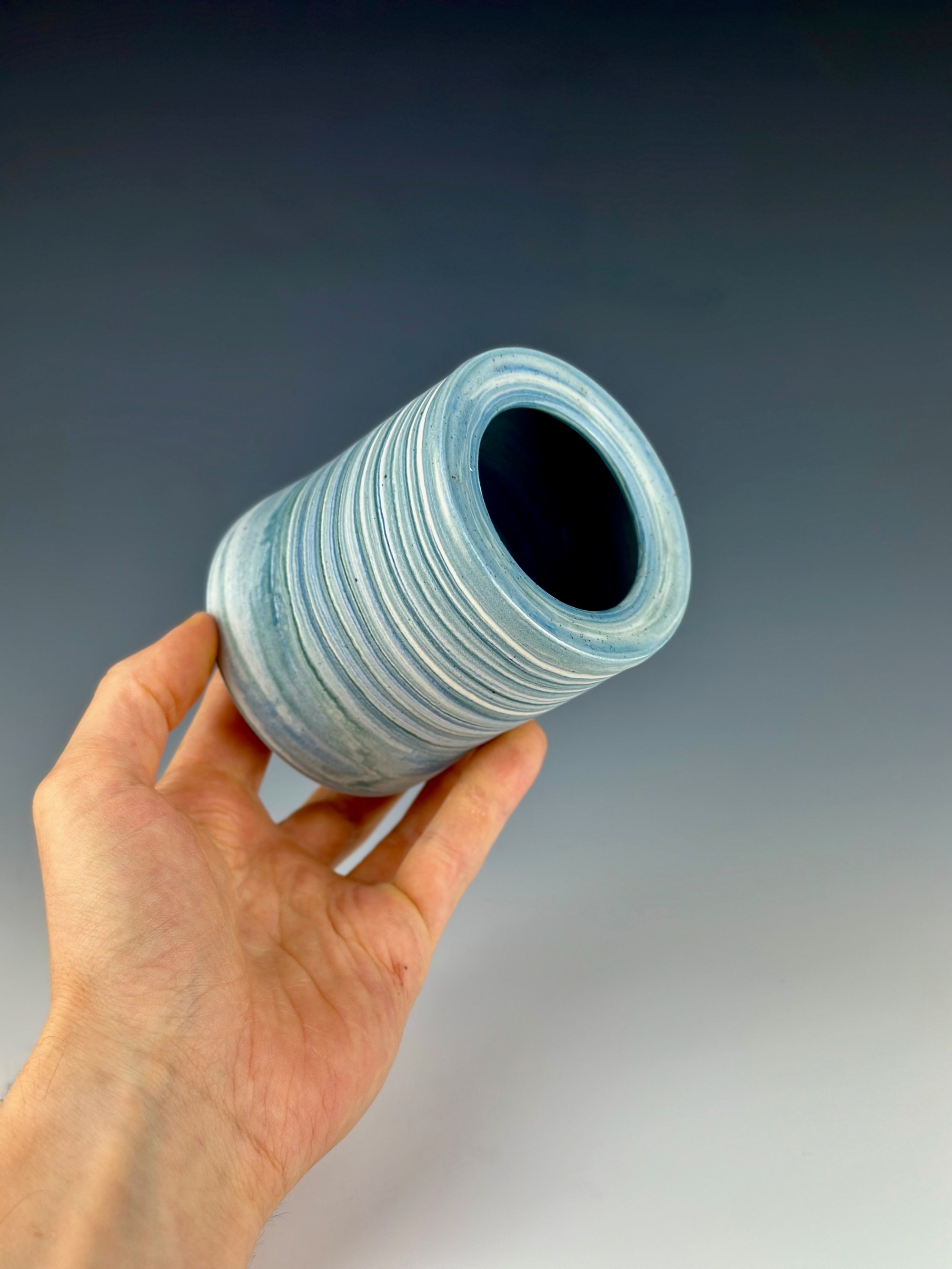 A marbled porcelain and ilmenite porcelain bud vase, which has been clear glazed on the interior, and wet sanded on the exterior unglazed surface. This piece has a set of black lines, which are created by carving a channel in the piece, filling it with black slip, and trimming away the excess. The lines sit flush with the body.