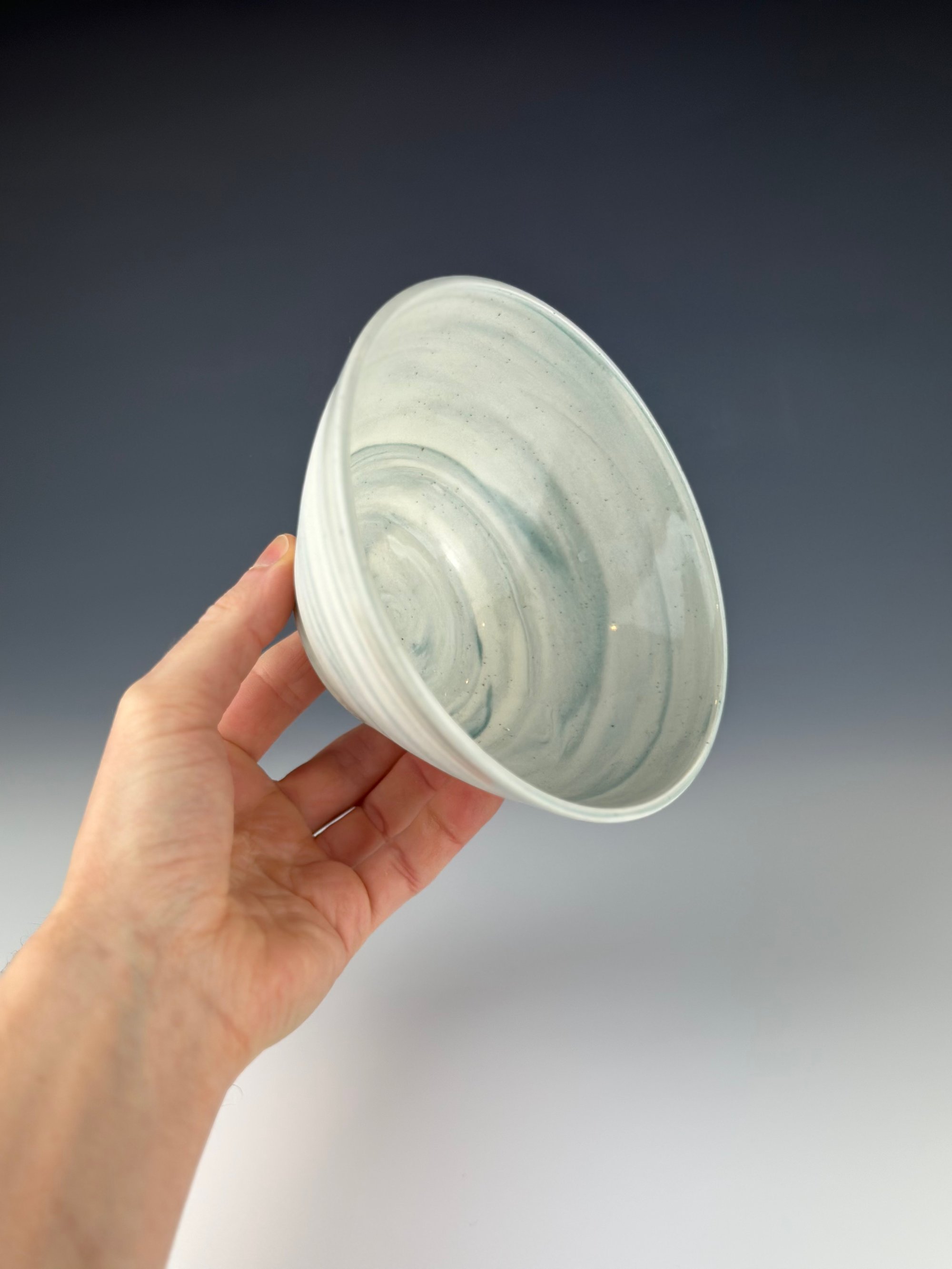 A marbled white and teal porcelain bowl which has been clear glazed on the interior and exterior lip, and wet sanded on the exterior unglazed surface.