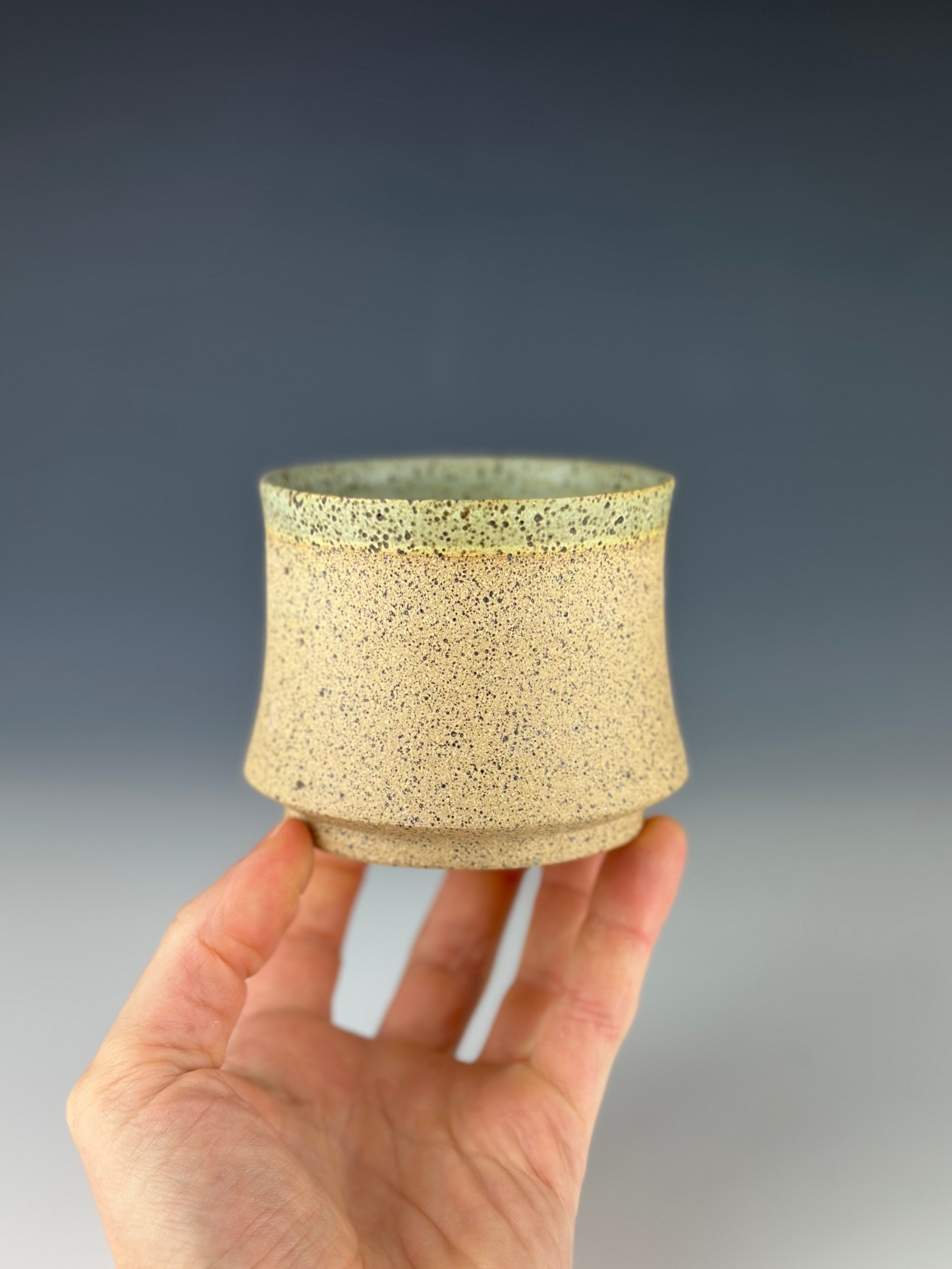A speckled stoneware tumbler which has been glazed on the interior and exterior lip, and wet sanded on the exterior unglazed surface.
