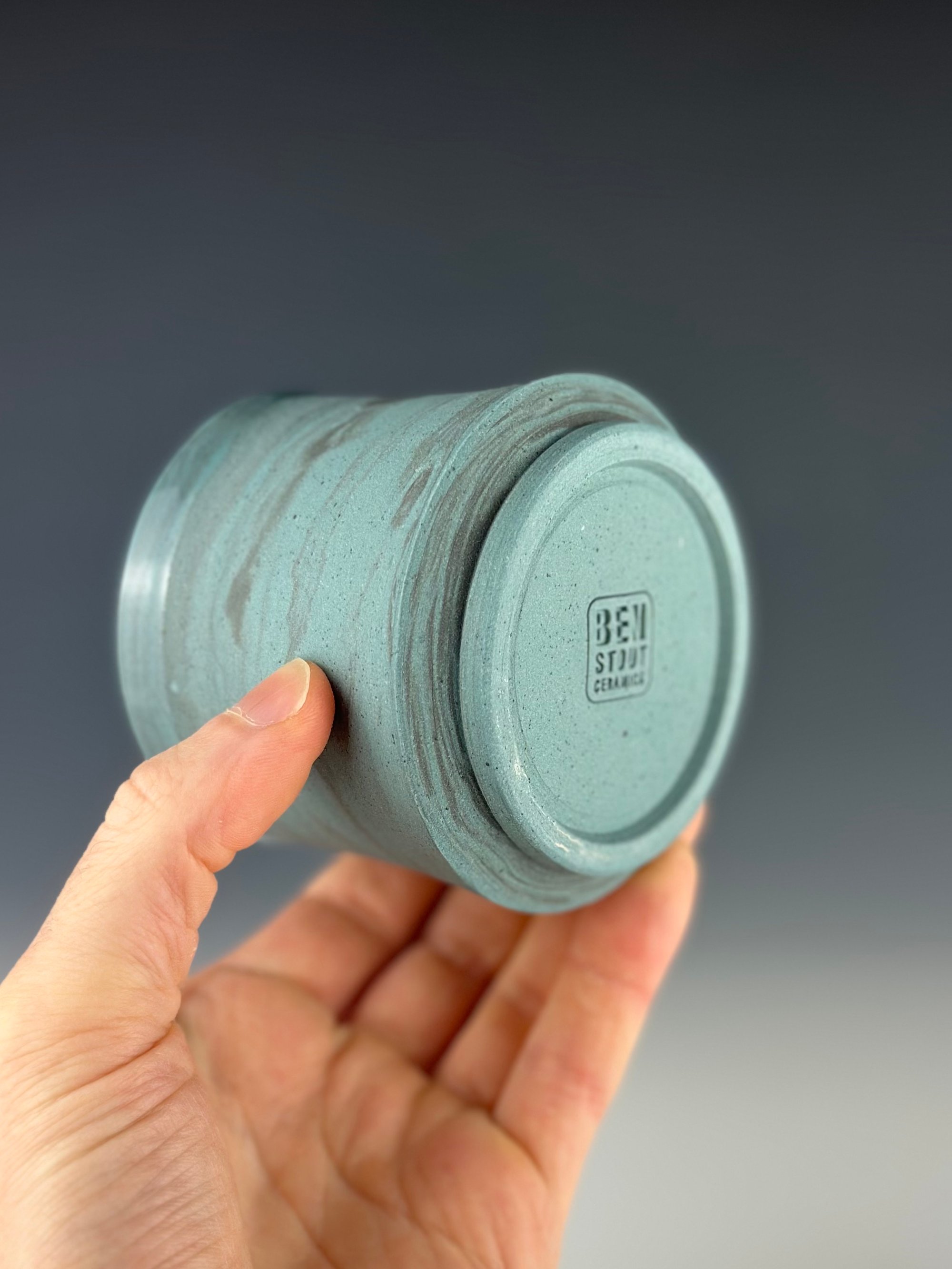 A teal and black marbled porcelain tumbler, which has been clear glazed on the interior and exterior lip, and wet sanded on the exterior unglazed surface.