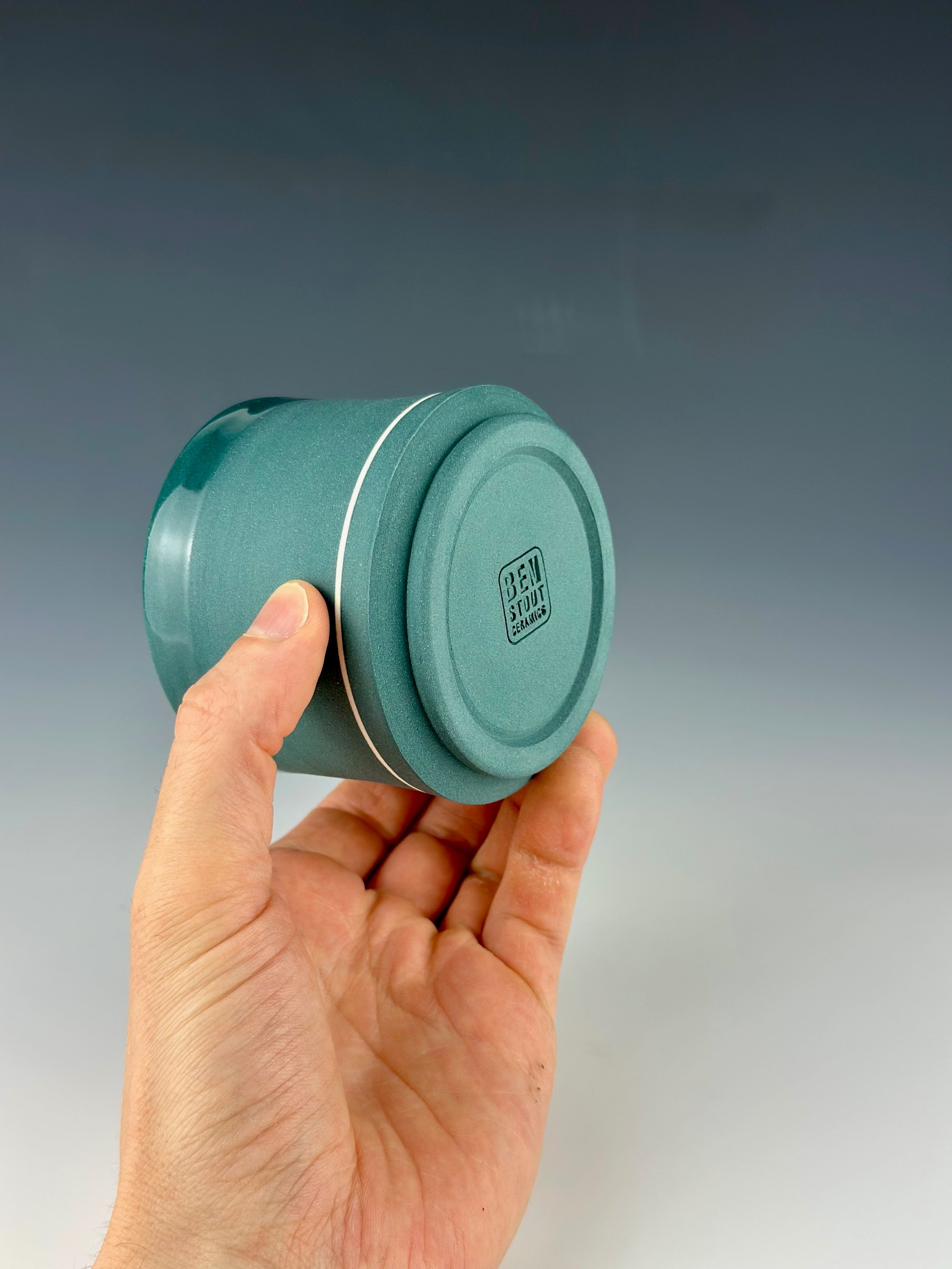 A teal porcelain tumbler, which has been clear glazed on the interior and exterior lip, and wet sanded on the exterior unglazed surface. This piece has an embedded white line, which is created by carving a channel in the piece, filling it with slip, and trimming away the excess. They sit flush with the body.