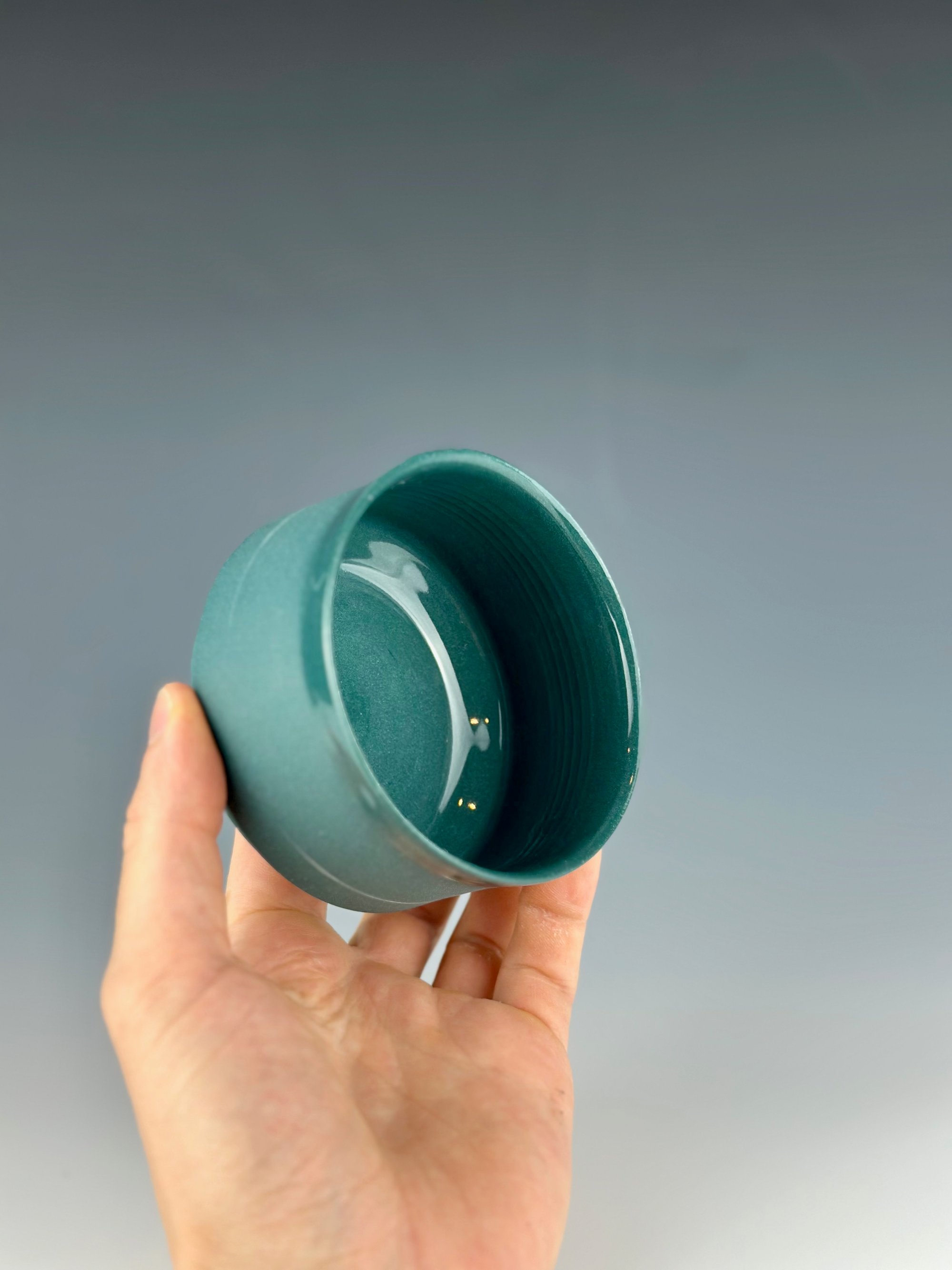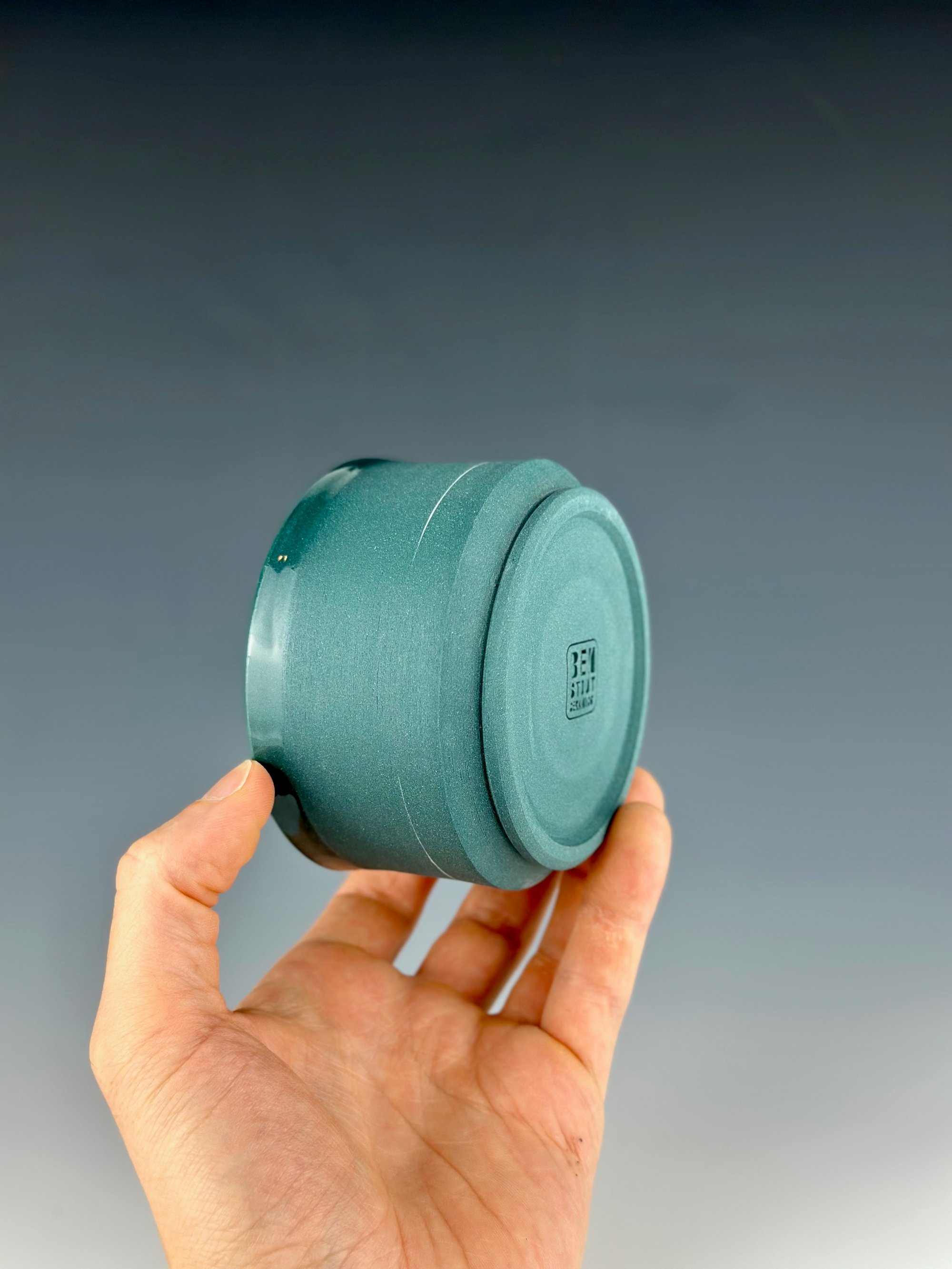 A teal porcelain tumbler, which has been clear glazed on the interior and exterior lip, and wet sanded on the exterior unglazed surface. This piece has a partial white line, which is created by carving a channel in the piece, filling it with slip, and trimming away the excess. They sit flush with the body.