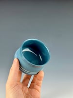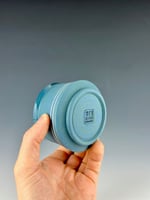 A teal and blue marbled porcelain tumbler, which has been clear glazed on the interior and exterior lip, and wet sanded on the exterior unglazed surface. This piece has a set of white lines, which are created by carving a channel in the piece, filling it with slip, and trimming away the excess. They sit flush with the body.