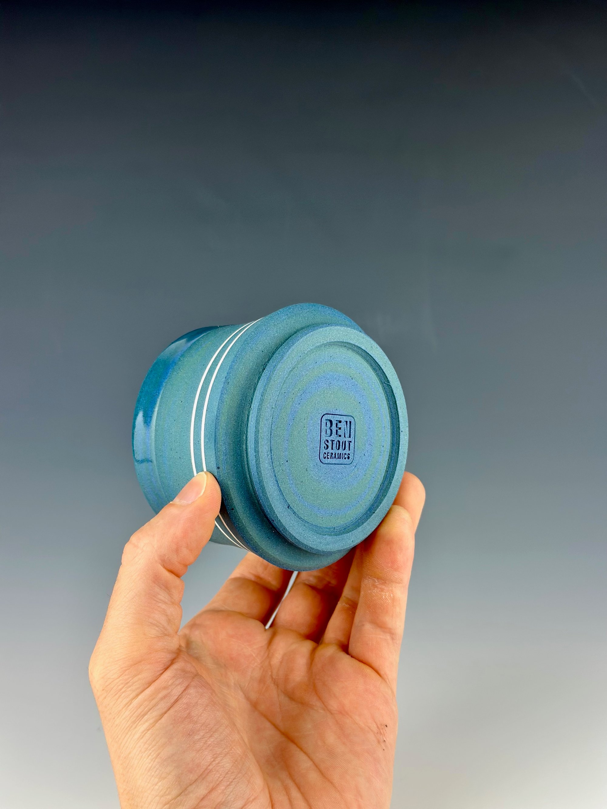 A teal and blue marbled porcelain tumbler, which has been clear glazed on the interior and exterior lip, and wet sanded on the exterior unglazed surface. This piece has a set of white lines, which are created by carving a channel in the piece, filling it with slip, and trimming away the excess. They sit flush with the body.