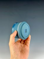 A teal and blue marbled porcelain tumbler, which has been clear glazed on the interior and exterior lip, and wet sanded on the exterior unglazed surface. This piece has a set of white lines, which are created by carving a channel in the piece, filling it with slip, and trimming away the excess. They sit flush with the body.
