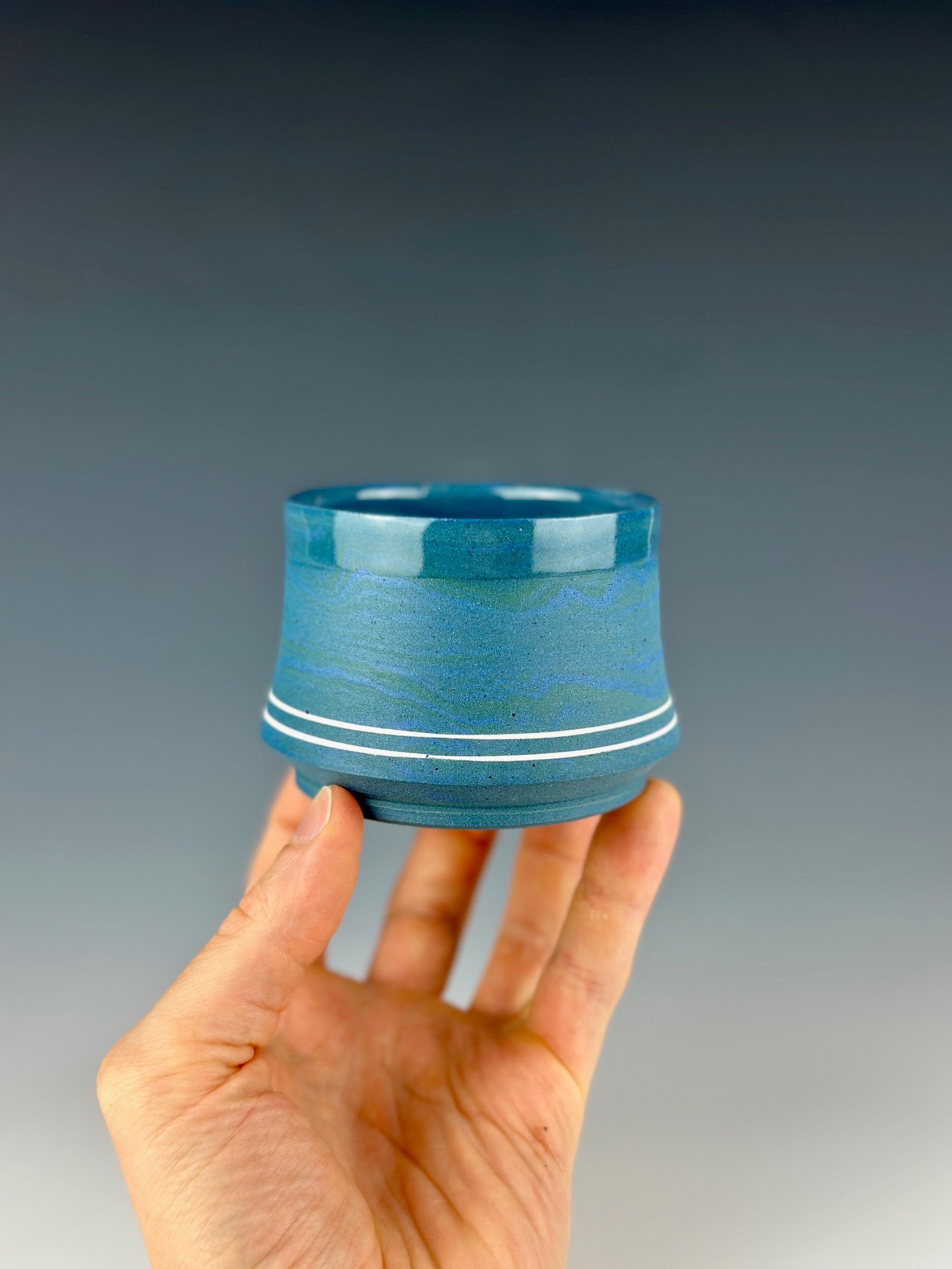 A teal and blue marbled porcelain tumbler, which has been clear glazed on the interior and exterior lip, and wet sanded on the exterior unglazed surface. This piece has a set of white lines, which are created by carving a channel in the piece, filling it with slip, and trimming away the excess. They sit flush with the body.
