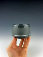 A black porcelain tumbler, which has been clear glazed on the interior and exterior lip, and wet sanded on the exterior unglazed surface. This piece has a white line, which is created by carving a channel in the piece, filling it with slip, and trimming away the excess. It sits flush with the body.