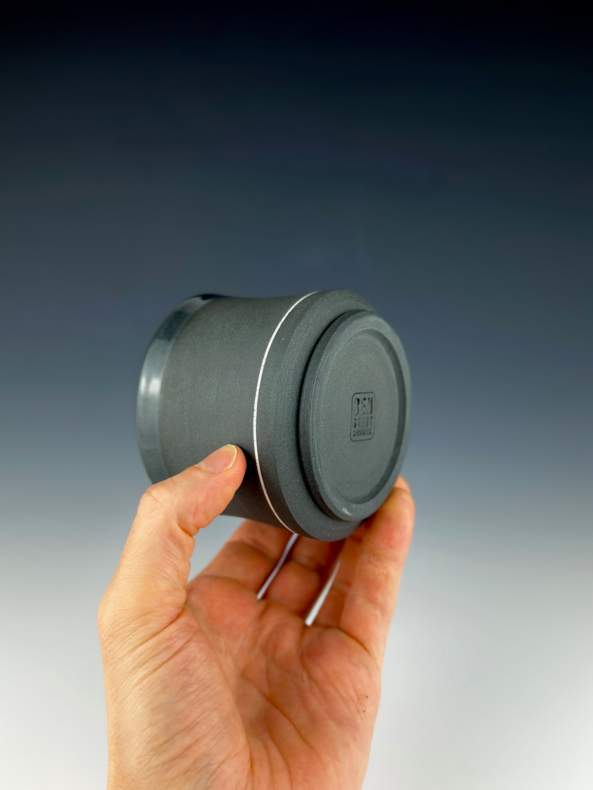 A black porcelain tumbler, which has been clear glazed on the interior and exterior lip, and wet sanded on the exterior unglazed surface. This piece has a white line, which is created by carving a channel in the piece, filling it with slip, and trimming away the excess. It sits flush with the body.