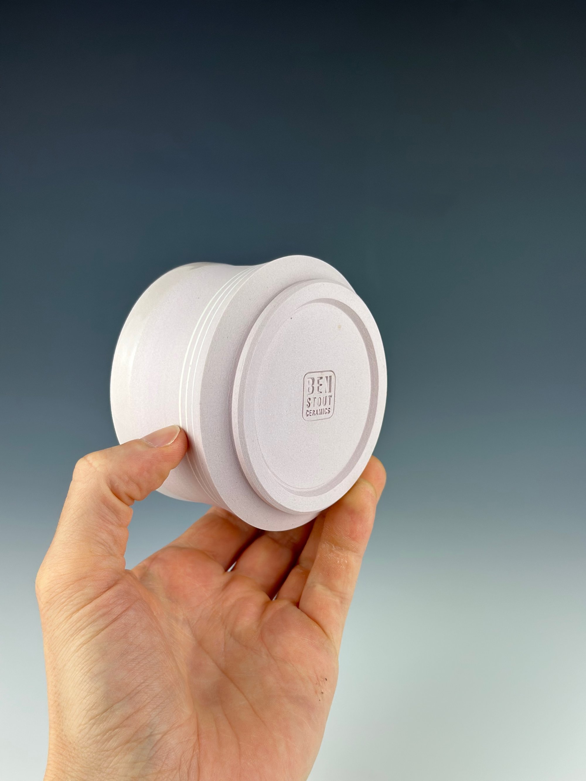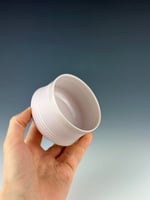 A lilac porcelain tumbler, which has been clear glazed on the interior and exterior lip, and wet sanded on the exterior unglazed surface. This piece has set of white lines, which are created by carving a channel in the piece, filling it with slip, and trimming away the excess. They sit flush with the body.