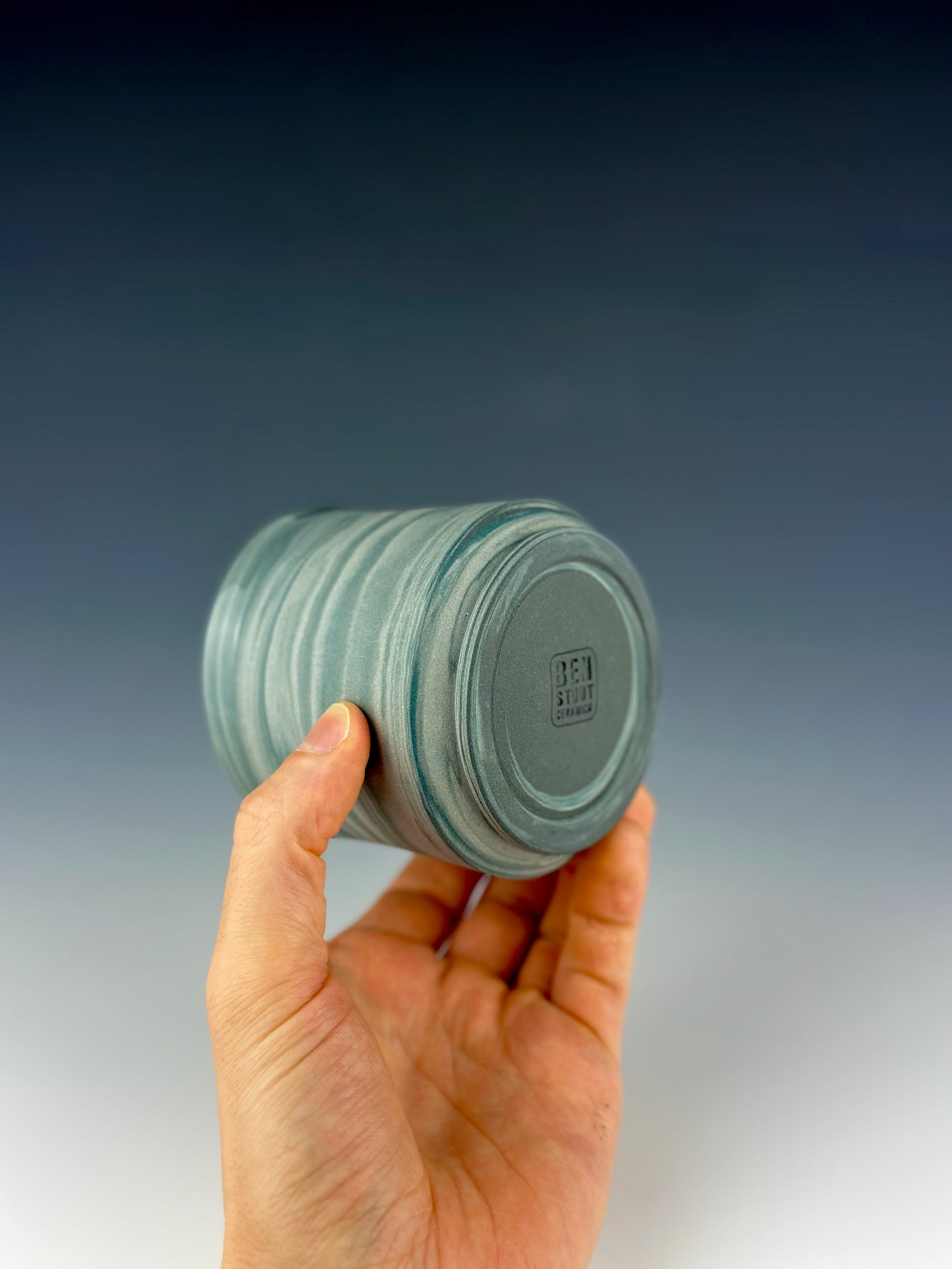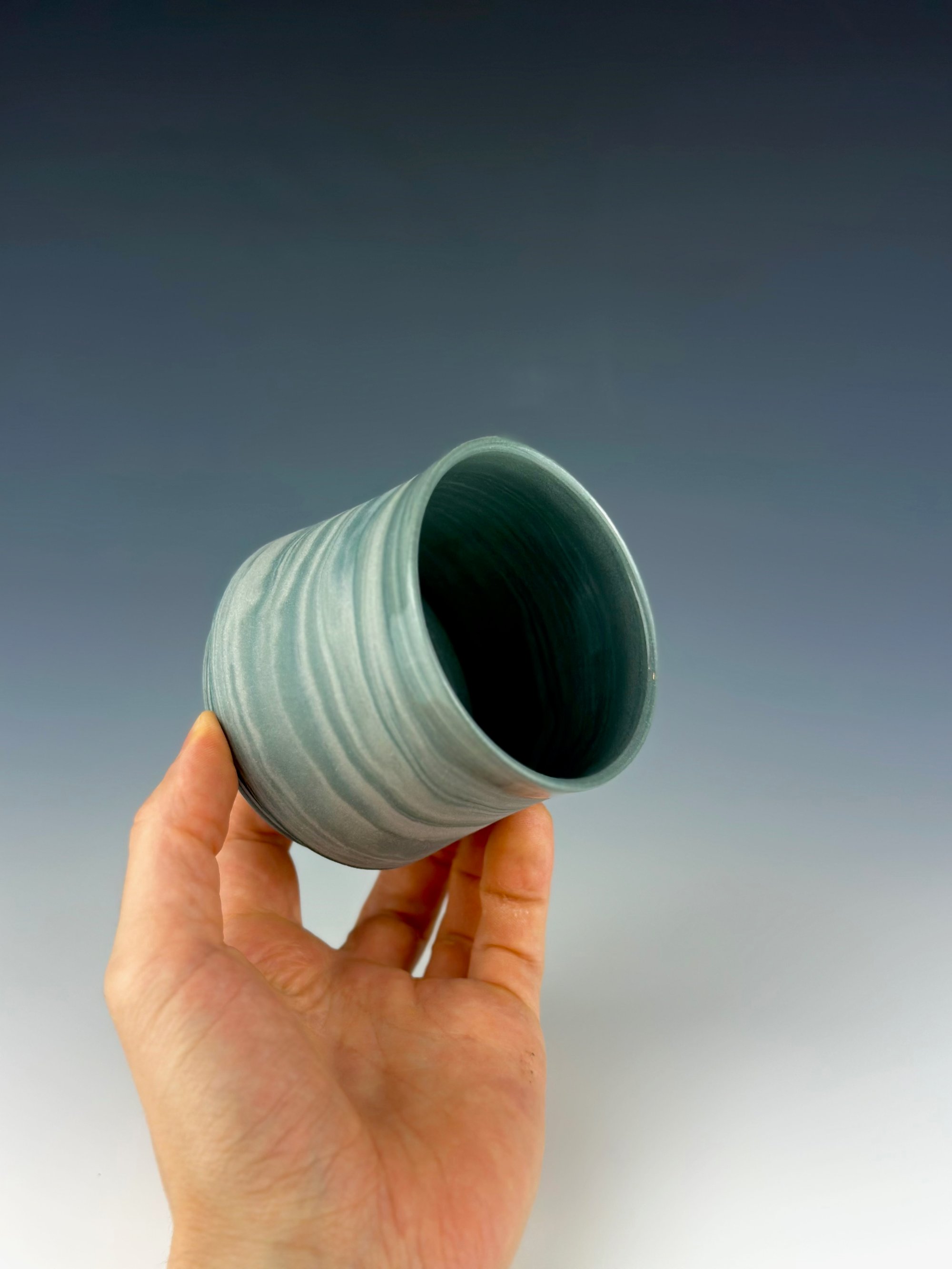 A grey, teal, and black marbled porcelain tumbler, which has been clear glazed on the interior and exterior lip, and wet sanded on the exterior unglazed surface.