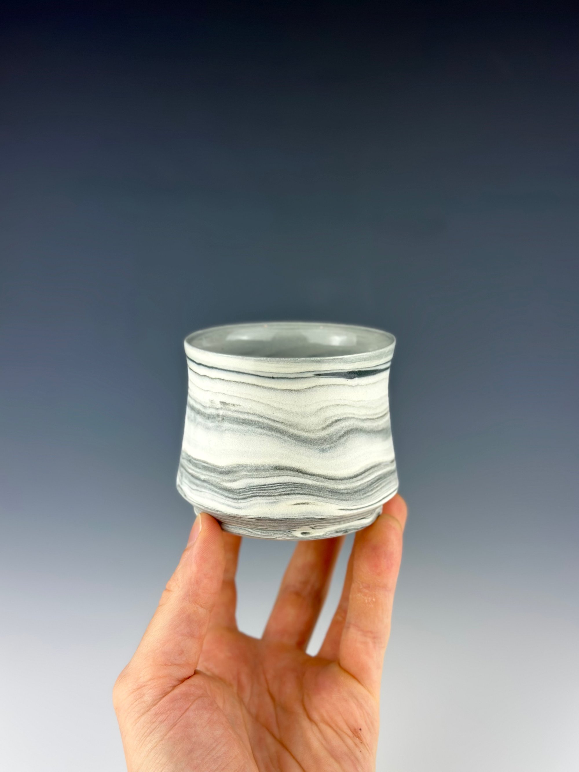 A black and white marbled porcelain tumbler, which has been clear glazed on the interior and exterior lip, and wet sanded on the exterior unglazed surface.