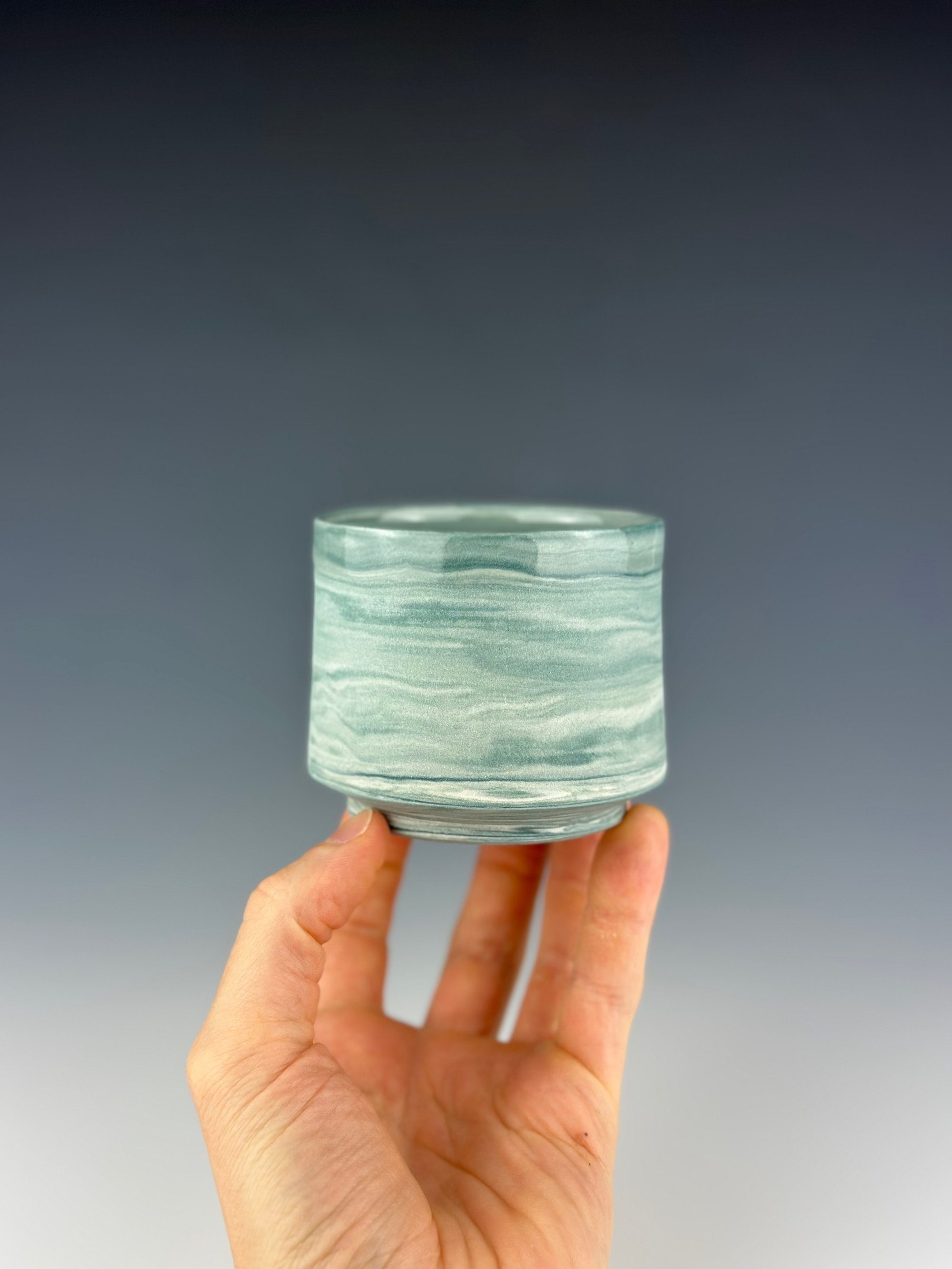 A white and teal marbled porcelain tumbler, which has been clear glazed on the interior and exterior lip, and wet sanded on the exterior unglazed surface.