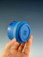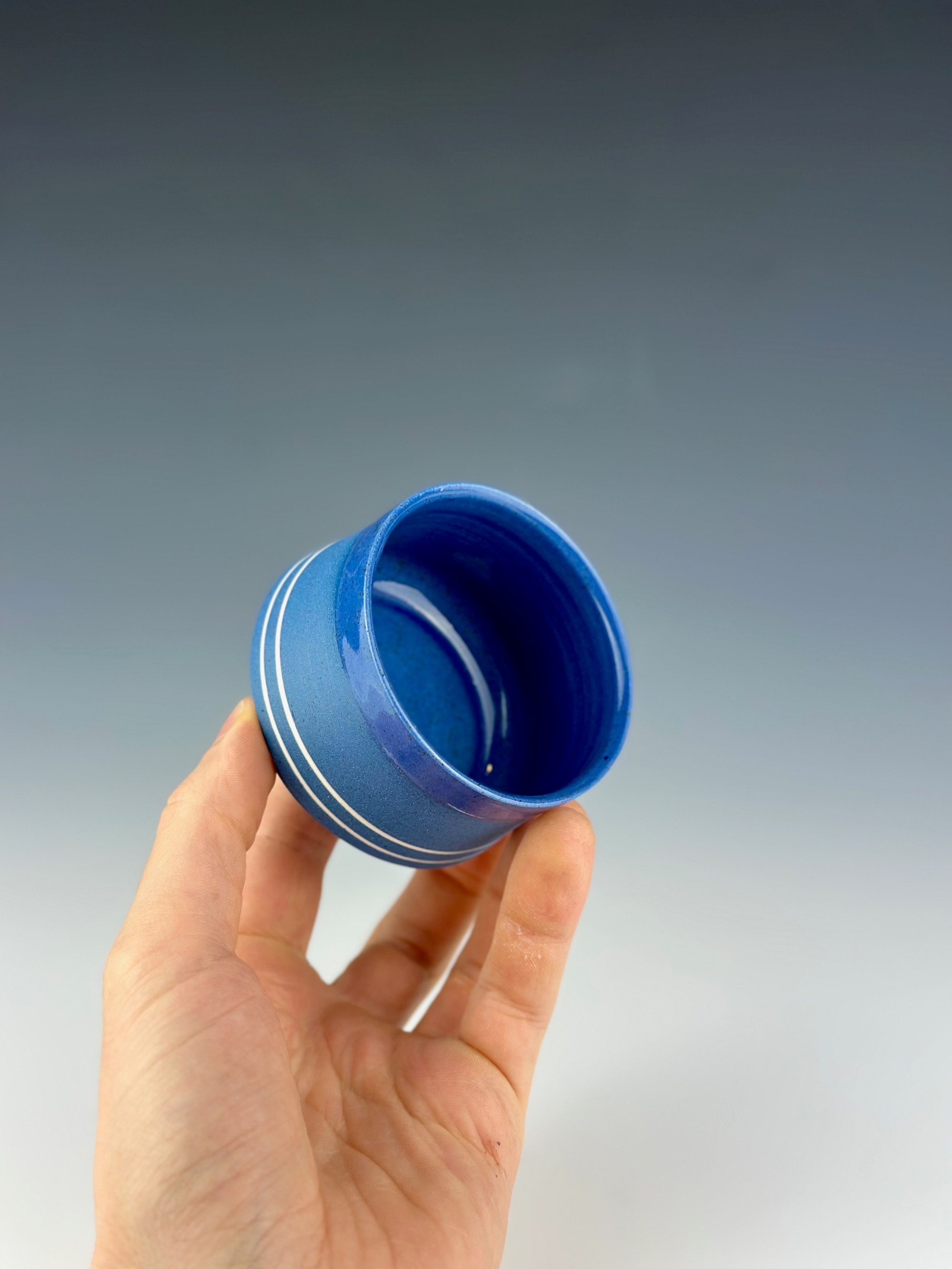 A blue porcelain tumbler, which has been clear glazed on the interior and exterior lip, and wet sanded on the exterior unglazed surface. This piece has set of white lines, which are created by carving a channel in the piece, filling it with slip, and trimming away the excess. They sit flush with the body.