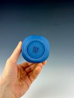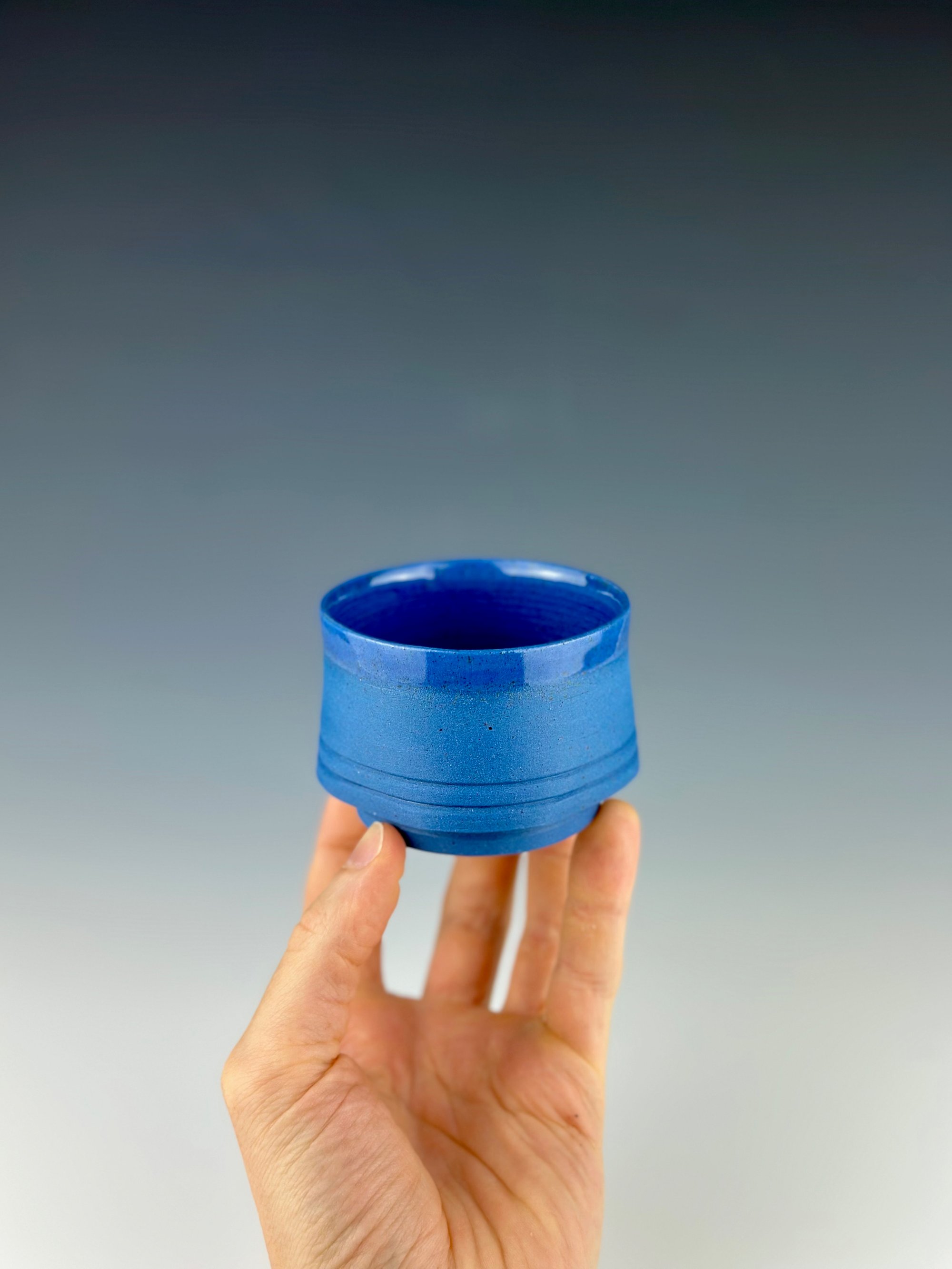 A blue porcelain tumbler, which has been clear glazed on the interior and exterior lip, and wet sanded on the exterior unglazed surface. Shortly after this piece is thrown, I lightly pressed in the walls to create a squared off look at the base. During trimming I added two carved ridges.