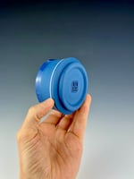 A blue porcelain tumbler, which has been clear glazed on the interior and exterior lip, and wet sanded on the exterior unglazed surface. This piece has a white line which is created by carving a channel in the piece, filling it with slip, and trimming away the excess. It sits flush with the body.