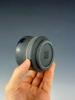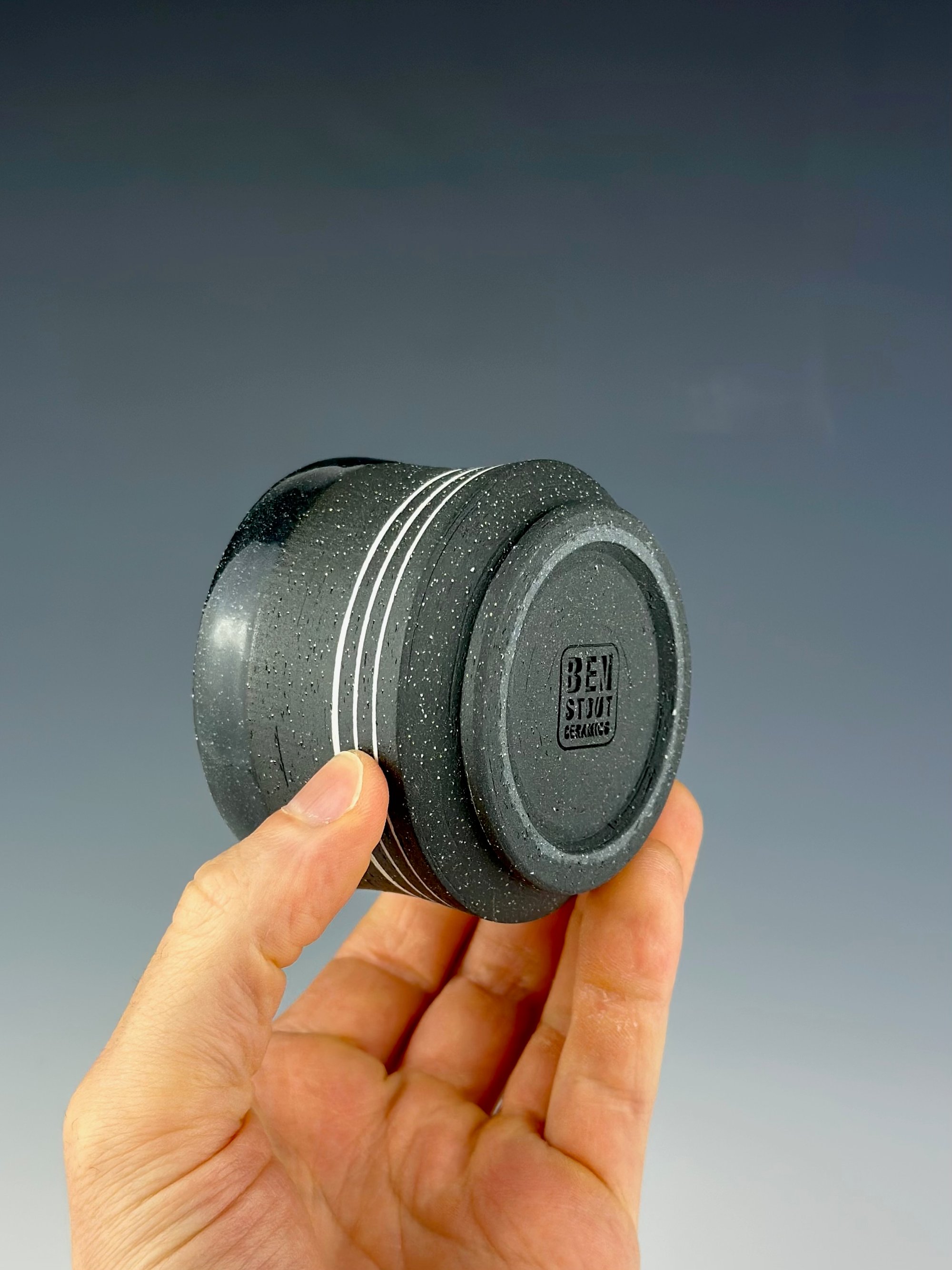 A black porcelain tumbler with white grog mixed in, which has been clear glazed on the interior and exterior lip, and wet sanded on the exterior unglazed surface. This piece has a set of white lines which are created by carving a channel in the piece, filling them with slip, and trimming away the excess. They sits flush with the body.
