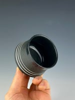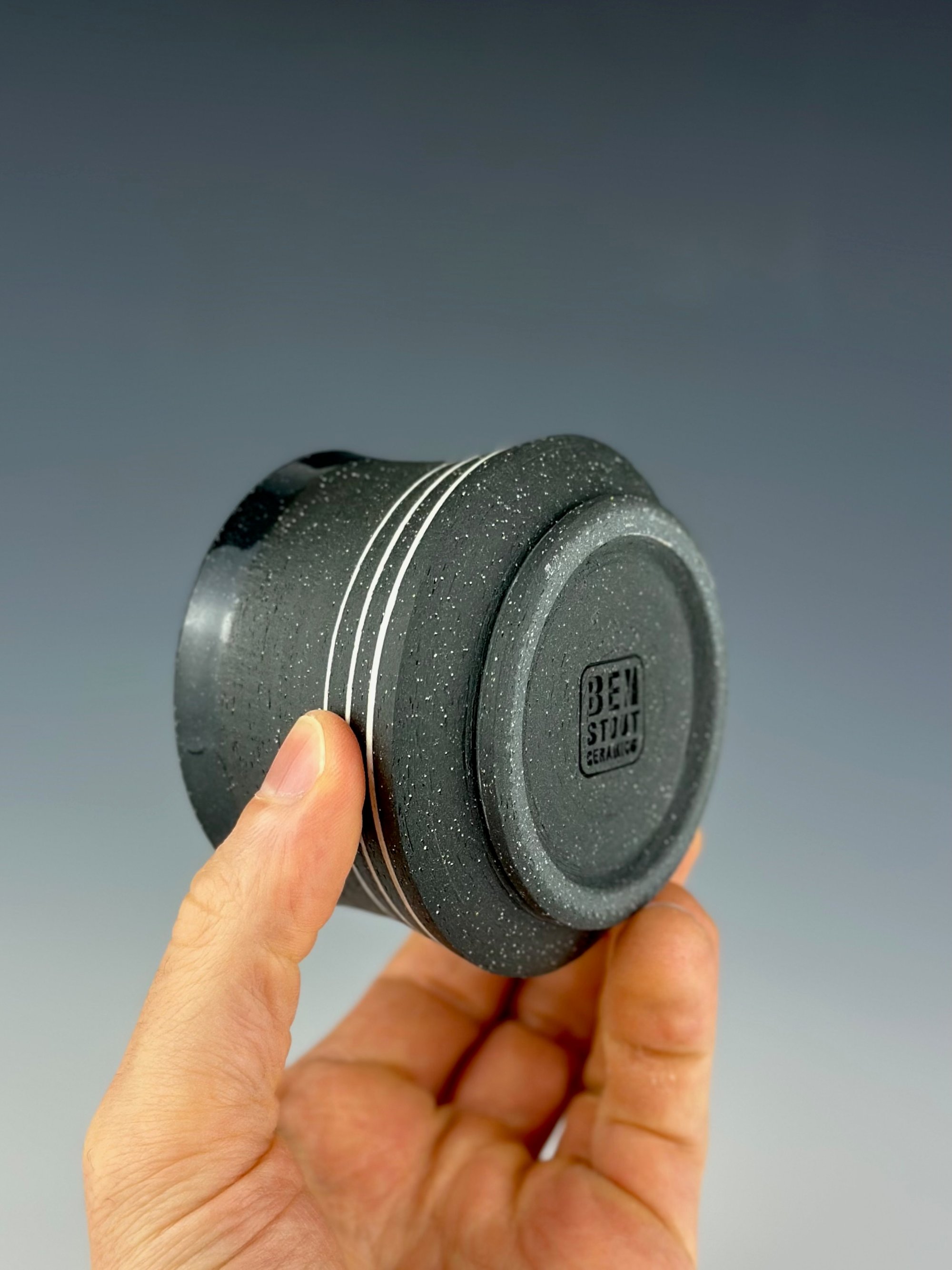 A black porcelain tumbler with white grog mixed in, which has been clear glazed on the interior and exterior lip, and wet sanded on the exterior unglazed surface. This piece has a set of white lines which are created by carving a channel in the piece, filling them with slip, and trimming away the excess. They sits flush with the body.