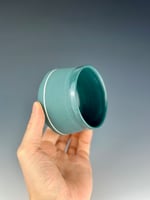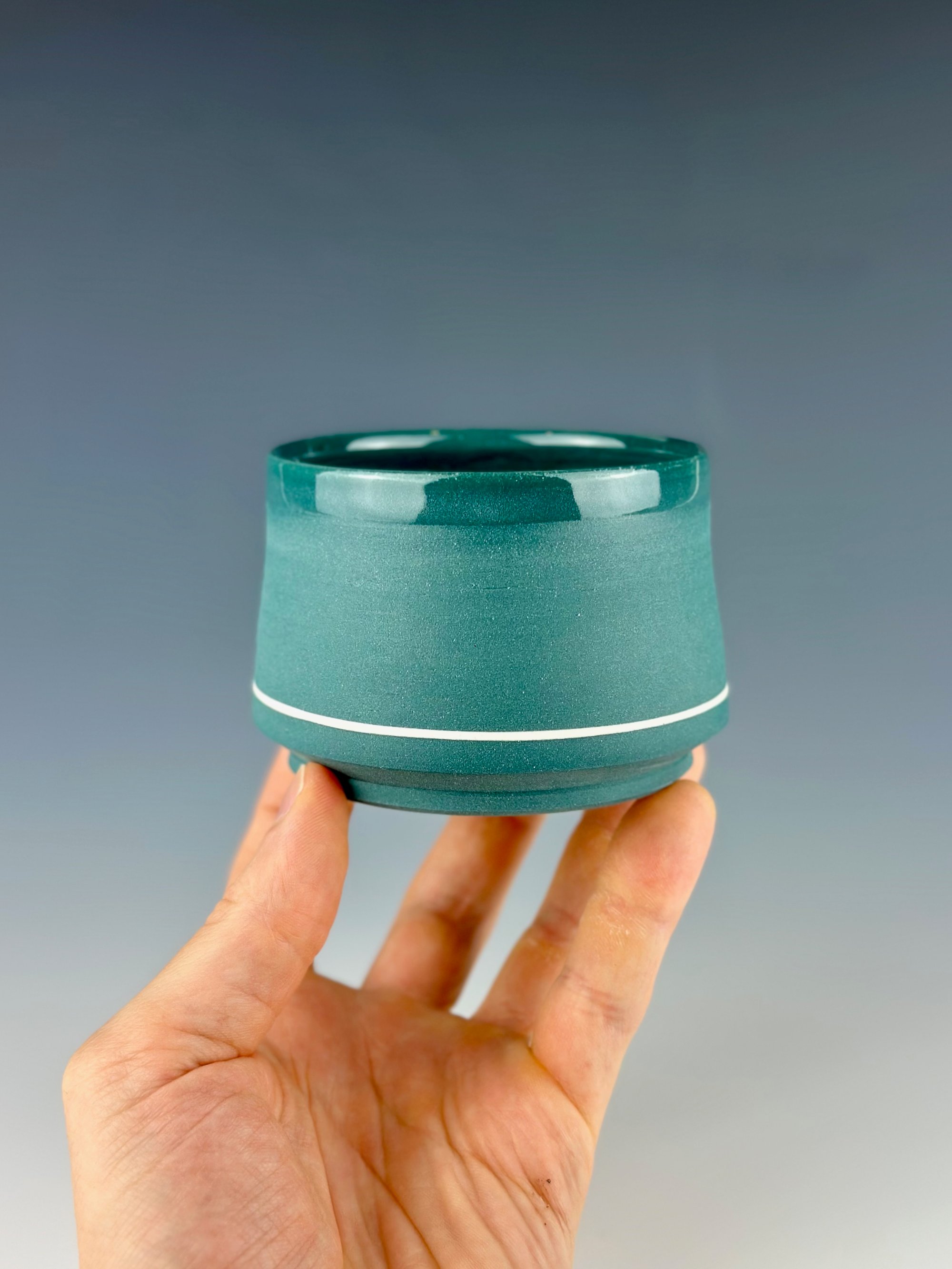 A teal porcelain tumbler, which has been clear glazed on the interior and exterior lip, and wet sanded on the exterior unglazed surface. This piece has an embedded white line, which is created by carving a channel in the piece, filling it with slip, and trimming away the excess. They sit flush with the body.