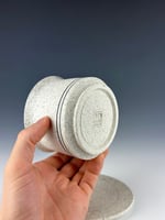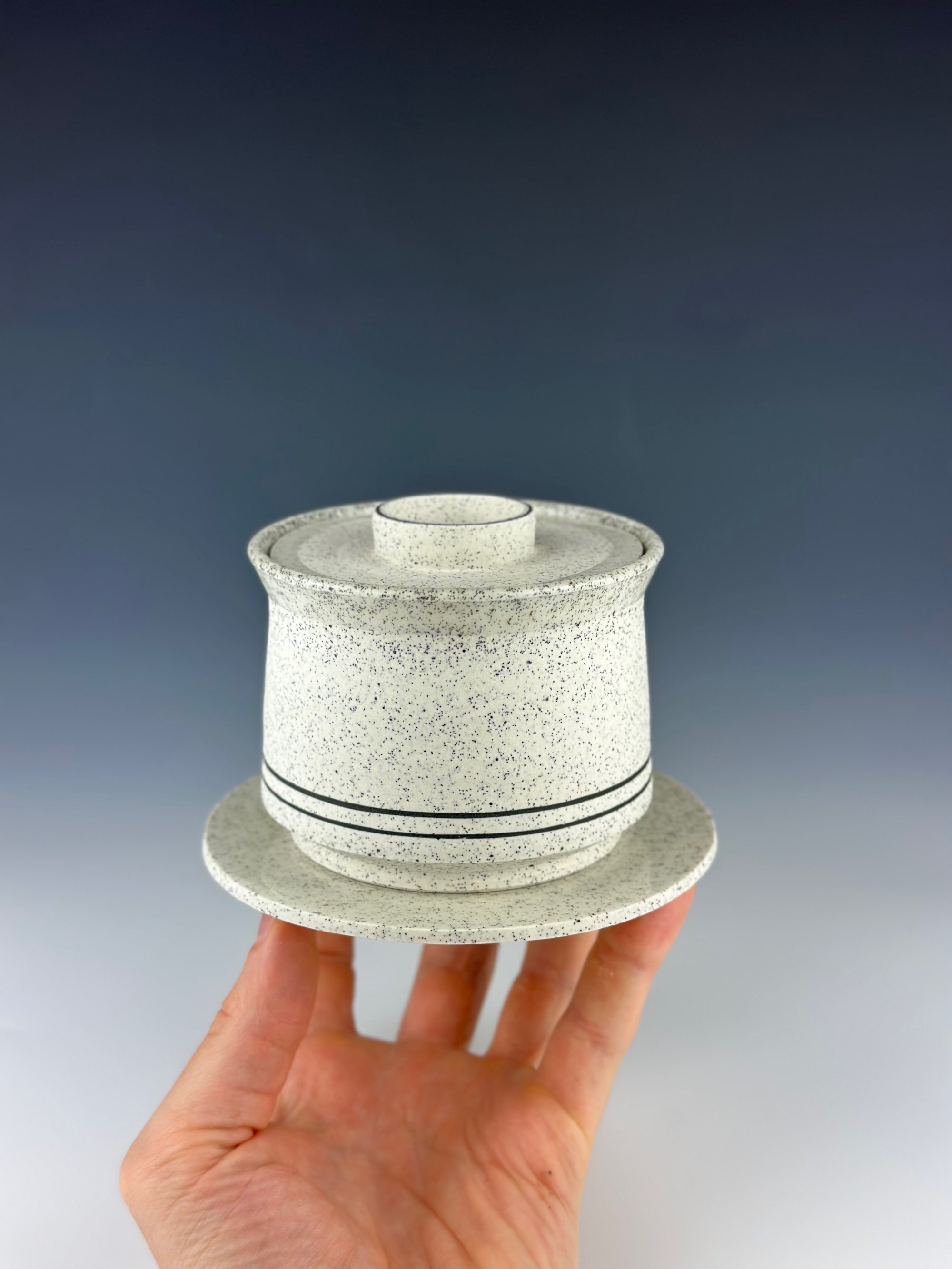 Porcelain and Ilmenite Gaiwan, which has been clear glazed on the interior and exterior lip, and wet sanded on the exterior unglazed surface. This piece has a carved lid, which has been clear glazed, as well as a base. The body of the piece has two black lines which sit flush with the body.